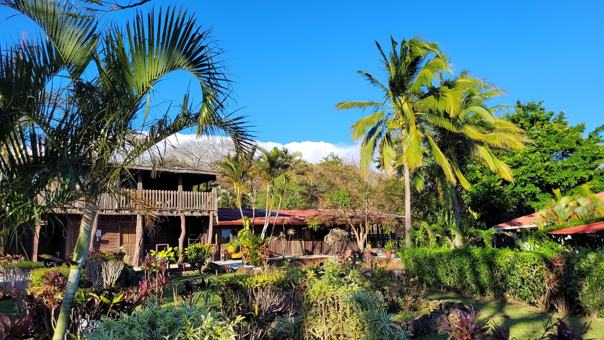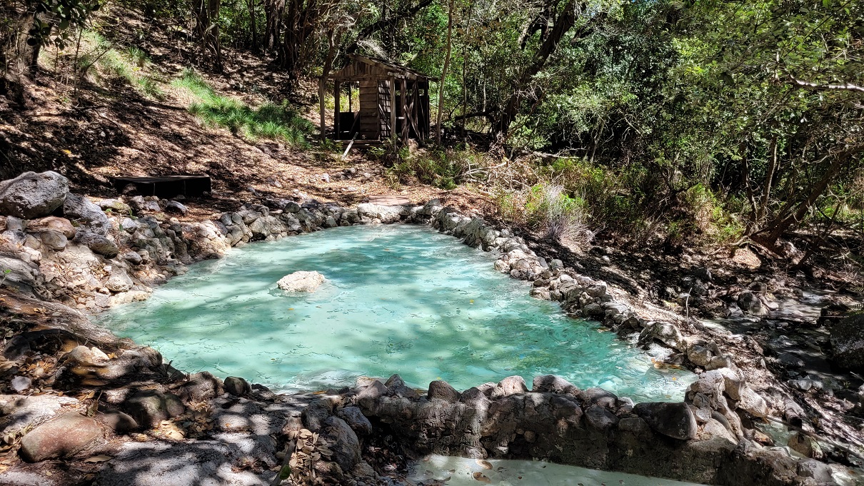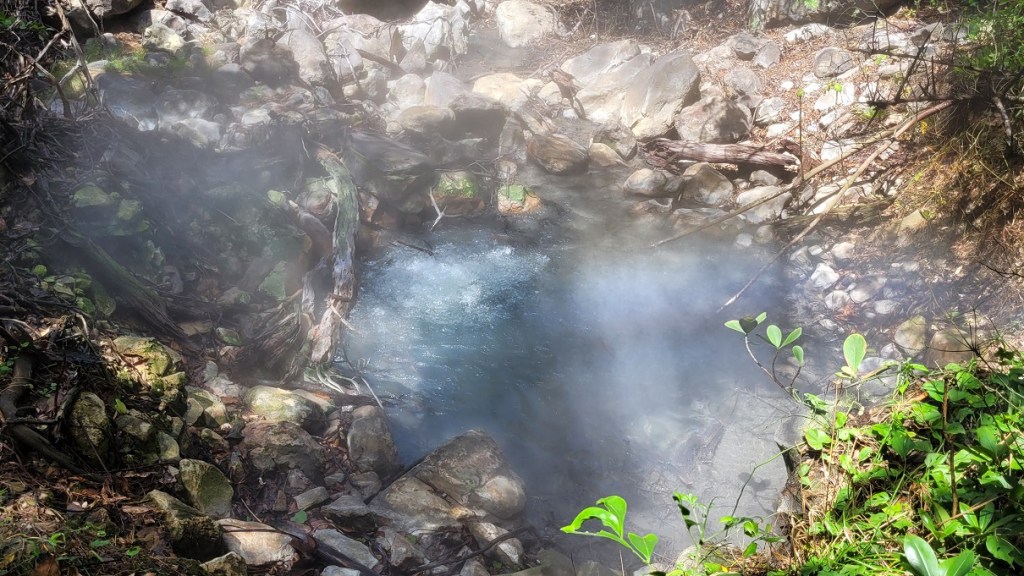 Majapaikassa leijui mädän munan lemu. Ensin epäilin putkistoa, mutta löyhäykset tulivatkin tulivuoren uumenista. Mökit oli ripoteltu pitkin laajaa puistoaluetta. Oltiin aivan kansallispuiston kupeessa ja lähellä sen kuumia lähteitä. Mutta myös majoitusalueeseen kuului patikkareitti omine lähteineen ja putouksineen.