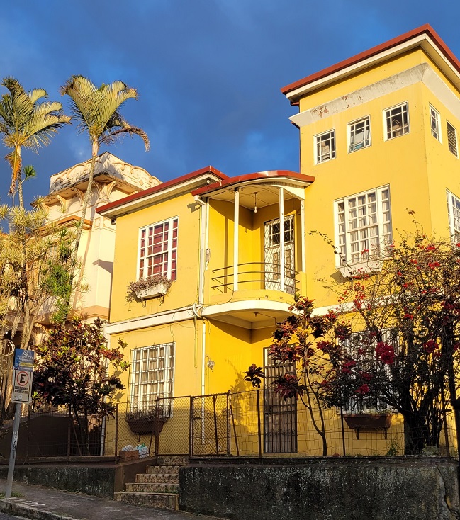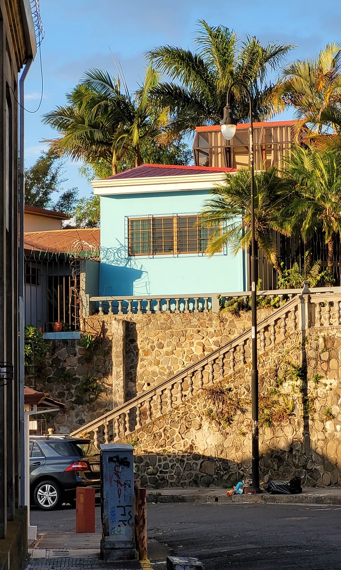 Enkä sitten syönytkään kaakkua, vaan suolaisia empanadaksia, sillä Costa Ricassa ei makea lopulta vetoakaan. Ehkä lämpö, kosteus, liikaa virikkeitä. Tärkeintä oli paikka. Kortteli on yksi kaupungin koruja, lähiseinillä köynnöksiä ja ympäristö kaunista eli ehdottomasti nähtävää. Kaunis ei nimittäin ole adjektiivi, jolla kaupunkia kuvaisin.