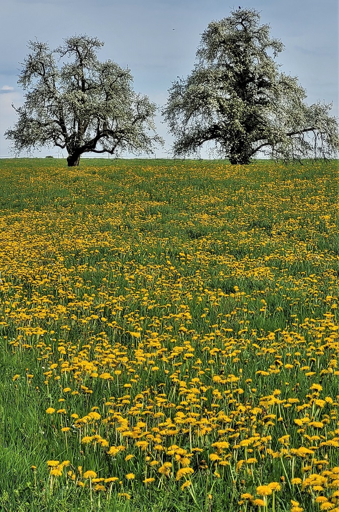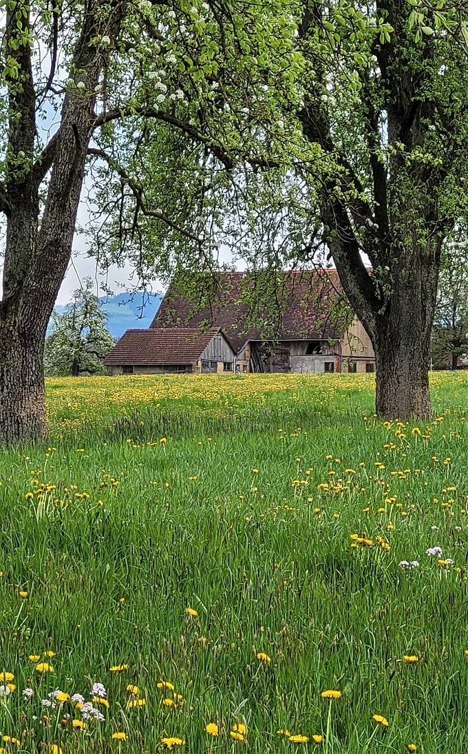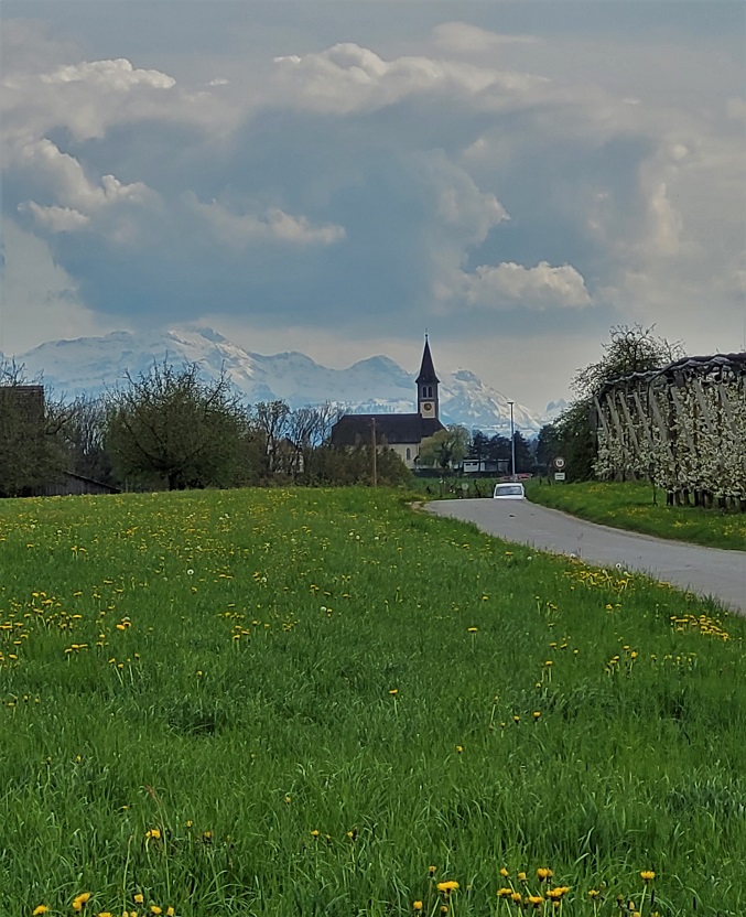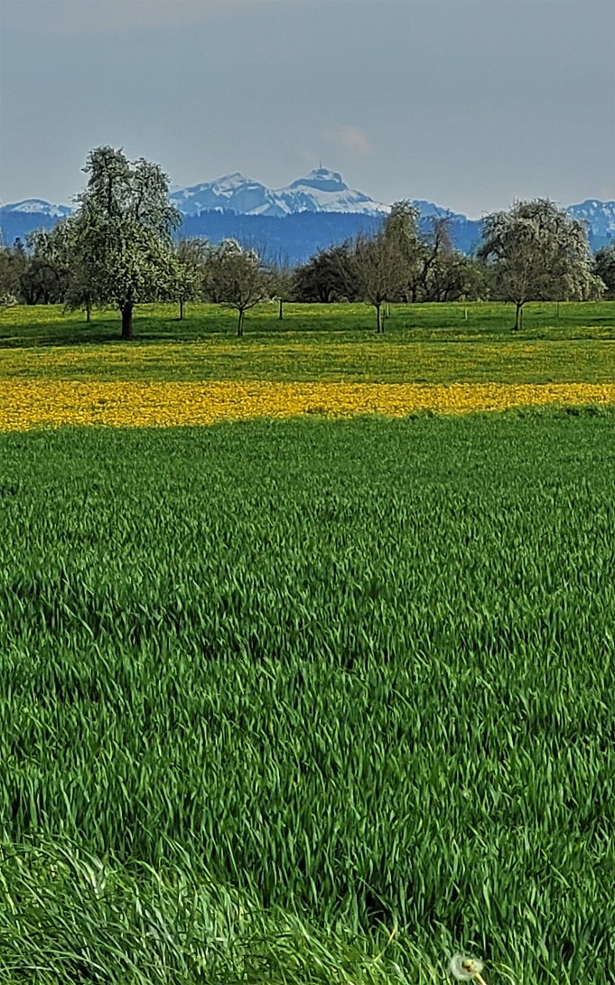 Voikukkia on pelloilla triljoona ja keltainen peitto on ihana. Taustalla pitäisi siintää Appenzellin Alppeja, mutta usva on tiukassa. Yritän zoomata ja kirkastaa näkymää. Juuri ja juuri pystyn kuvittelemaan muhkeat vuoret maalaismaisemaan.