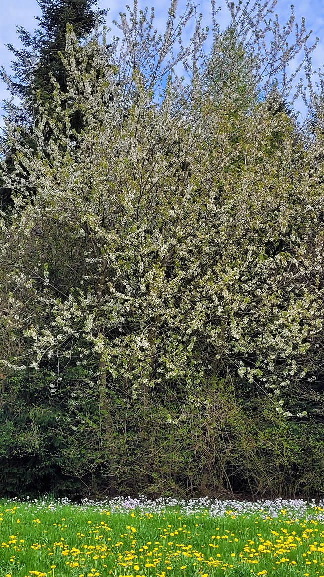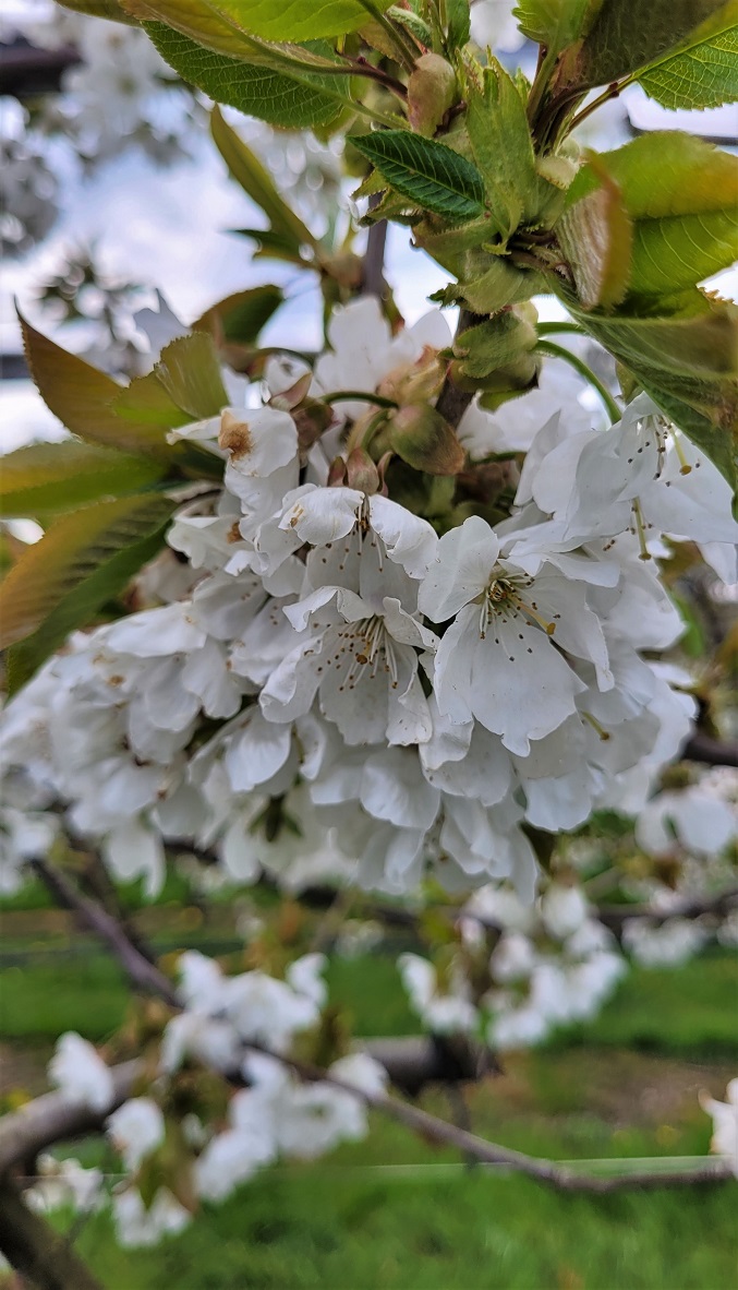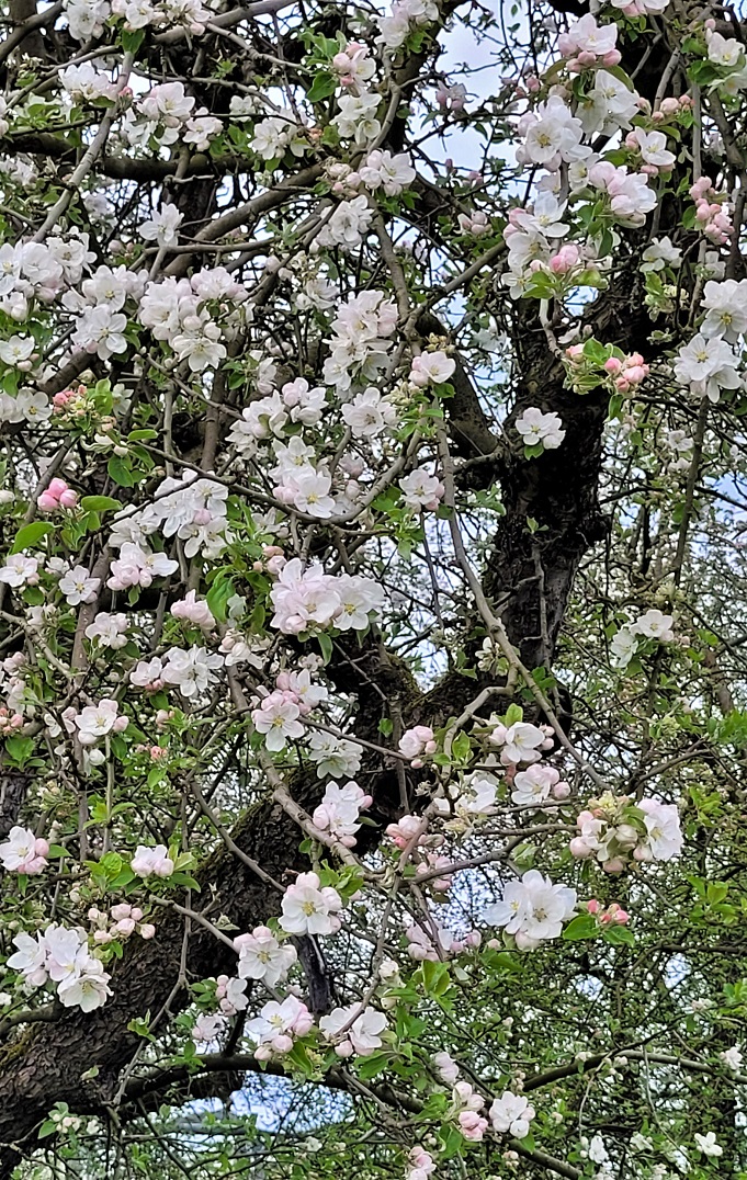 Ehkä siksi monissa puissa on jo pienet lehdet kukkien lisäksi. Vihertävän valkoiset puut on kummallinen näky; mitä se tuleville omenoille merkitsee, jää arvailun varaan. Ei siis hajuakaan. Ehkä sekin käy?