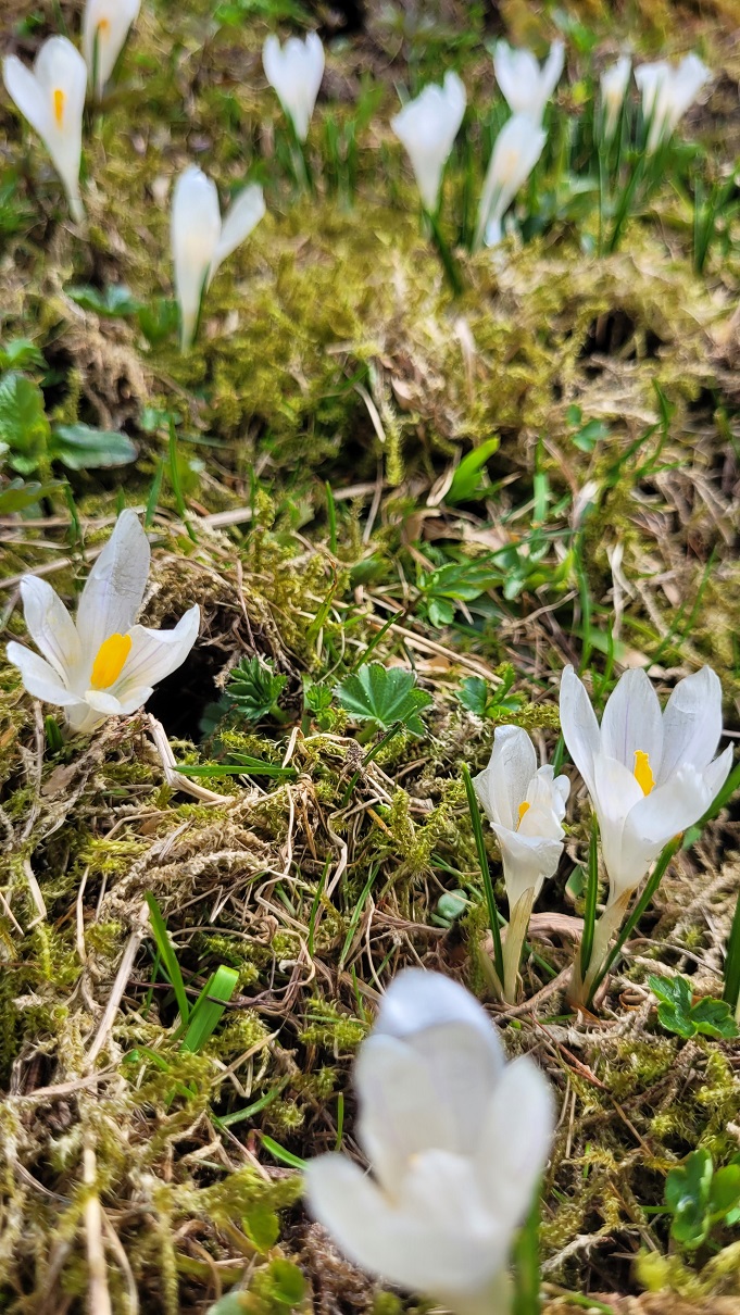 Krookusten aika oli selvästikin jo ohi, pettymysten pettymys. Sata metriä korkeammalla sydän otti loikan, siellä niitä oli, valkoisia täpliä siellä täällä, joka puolella. Villien krookuksten bongaaminen vaati ajoitusta ja salaa toivoin, että edes jokunen olisi vielä kukassa.