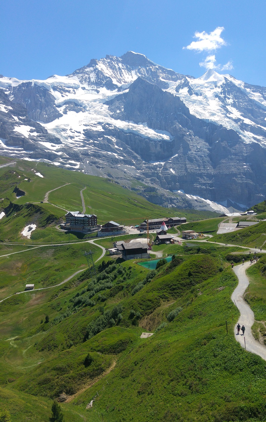 Ei jyrkännettä, ei rotkoa, sen sijaan Jungfraujochin alueen muhkeat lumihuiput ympärillä. Reitti on merkitty alppipatikkapoluksi, mutta helppokulkuinen. Jos kuplahissi kauhistuttaa, voi reissun tehdä myös aloittaen Kleine Scheideggista ja palaten samaan pisteeseen. Alas vuorelta pääsee junalla.