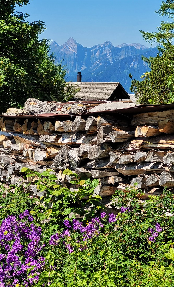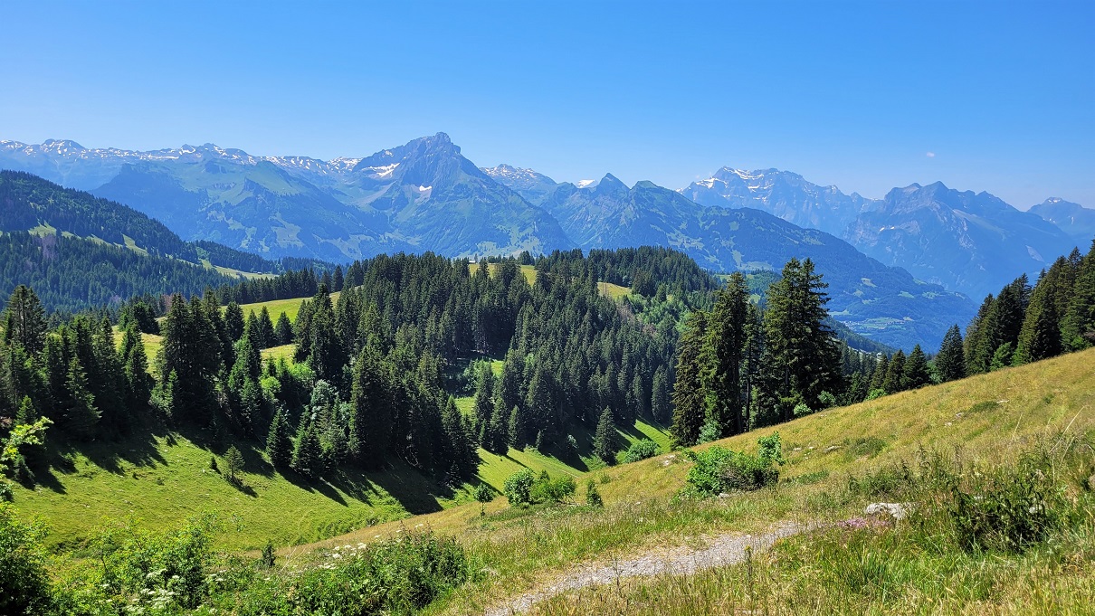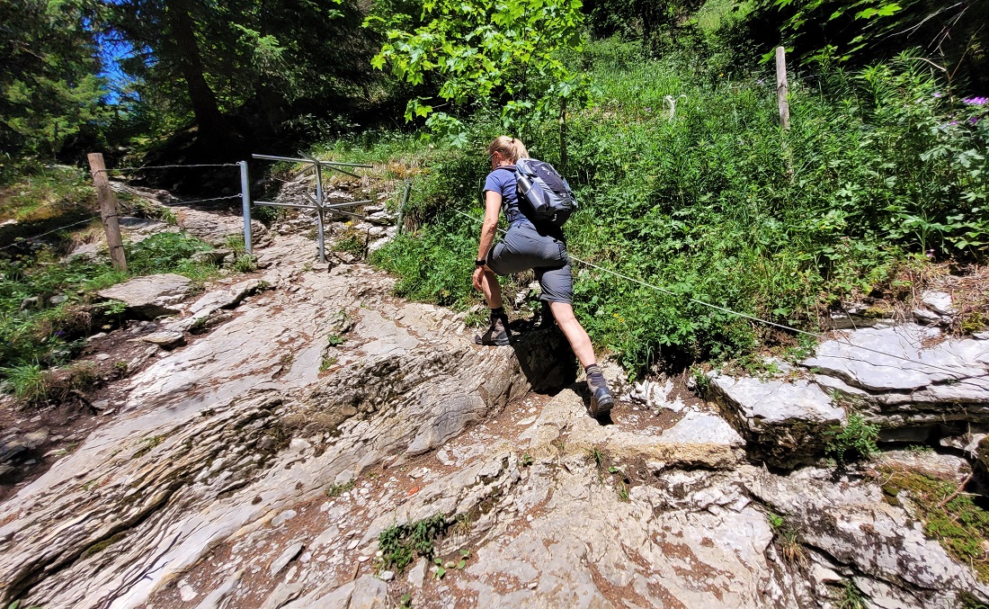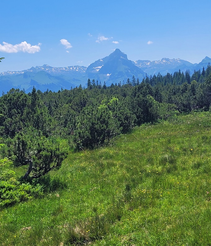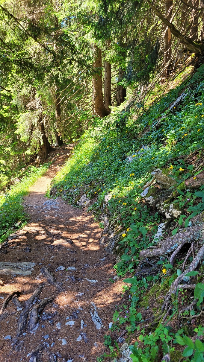 Koronan jälkeiset keuhkot joutuivat lopulta kovimmille autossa; yskin siitepölyä vedet silmissä koko päivän edestä. Arvenbüelin kylästä kohoavalla vanhalla huoltotiellä pidin pari paussia, ettei pulssi kohoaisi heti alussa tappiin ja ennen metsäpolkua oli pakko pistellä eväät, sillä kokovartalovapina alkoi olla häiritsevä. Kivellä istuessa, Glarusin Alpit edessäni, olo rauhoittui. Katselin muurahaisia, valtavan pontevia tummanvihreitä nokkosia, polulla ja ilmassa liiteleviä valkoisia, valko-oransseja, lilansinisiä ja aivan tummia perhosia.