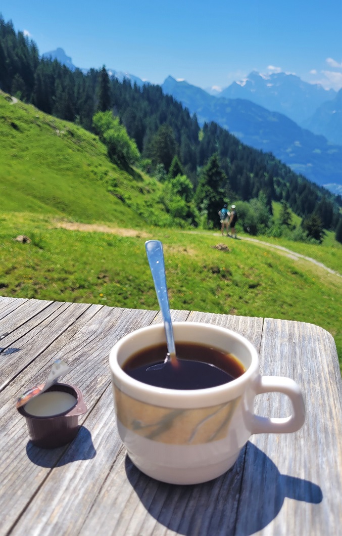 Keskiväliltä löytyi alppikuppila, aivan lirua kahvia ja tietenkin lehmiä. Sinne meidät johdattivat kiviin maalatut leppäkertut. Perheen tyttäret olivat tarjoiluvuorossa, kiikuttivat juomista janoisille, röstiä ja bratwursteja nälkäisille. Osa lehmistä hamusi rinteessä heinää, vasikat lojuivat alempana auringossa. Sisällä navetassa toimi sulassa sovussa muutaman lehmän vieressä kuppilan astianpesuosasto. Makkarat tirisivät ulkona, röstit paistuivat ehkä ylempänä teltan suojissa.