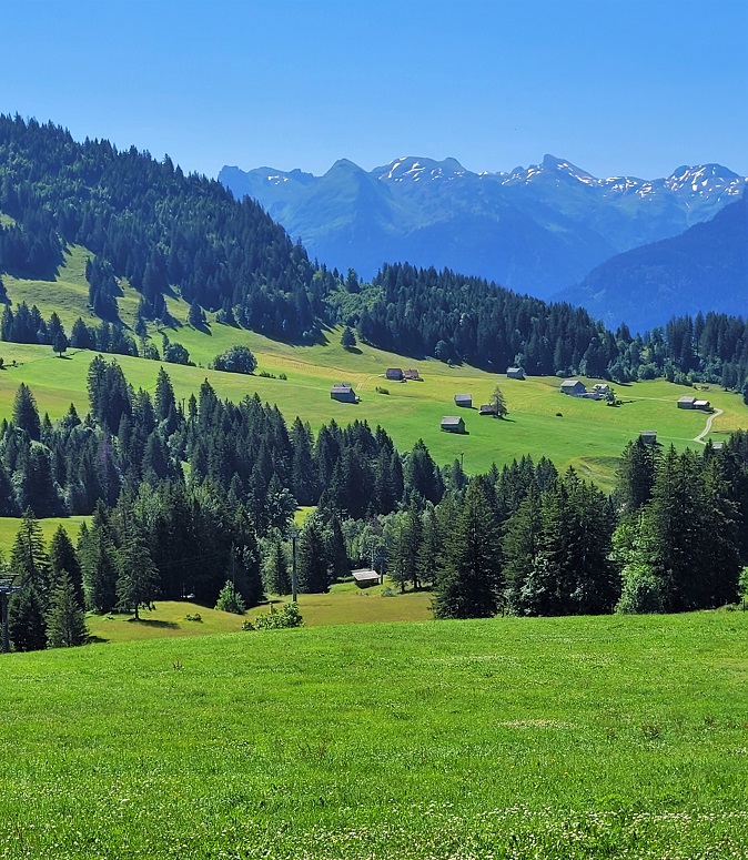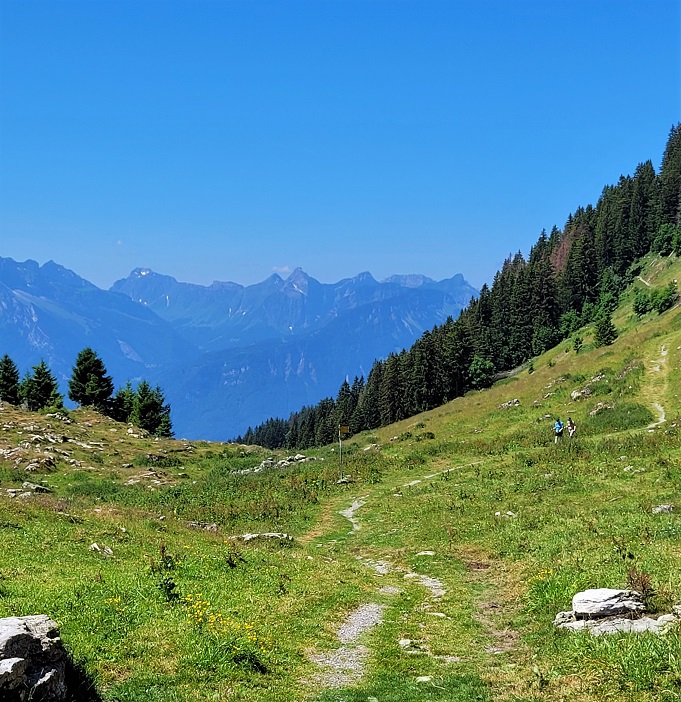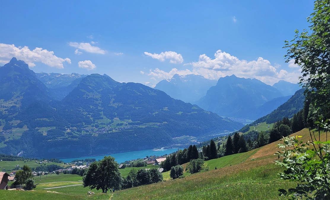 Kirkkaan turkoosina loistavan Walenseen yläpuolella kulkee Höhenweg Amden, upeita maisemia, helposti saavutettavissa. Kolmisen sataa metriä nousua on suurinpiirtein sama kuin omalla kylällä, joten se onnistuisi. Tuntimäärä kuulosti haasteelliselta, mutta kai lapsille sopiva reitti passaisi myös toipilaalle.