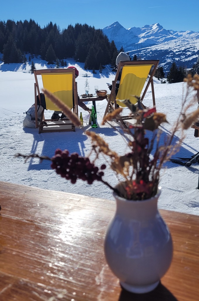 Yhdet leivät syötiin hangessa istahtaen, toiset penkillä. Aurinko lämmitti niin ihanasti, että raukeus valtasi jäsenet. Onneksi heti jälkimmäisen tauon jälkeen oltiin jo Skihüttellä, jonka pihalle oli levitetty lepotuoleja ja pöytiä penkkeineen. Istuskeltiin vielä hetki kahvi tekosyynä. Tällä mökillä voi myös yöpyä ja tietenkin ruokailla. Ruokalista oli melko perinteinen, mutta selvästi modernilla twistillä, kaikki näytti herkulliselta. Pahus vain, että oli juuri tullut syötyä eväät.
