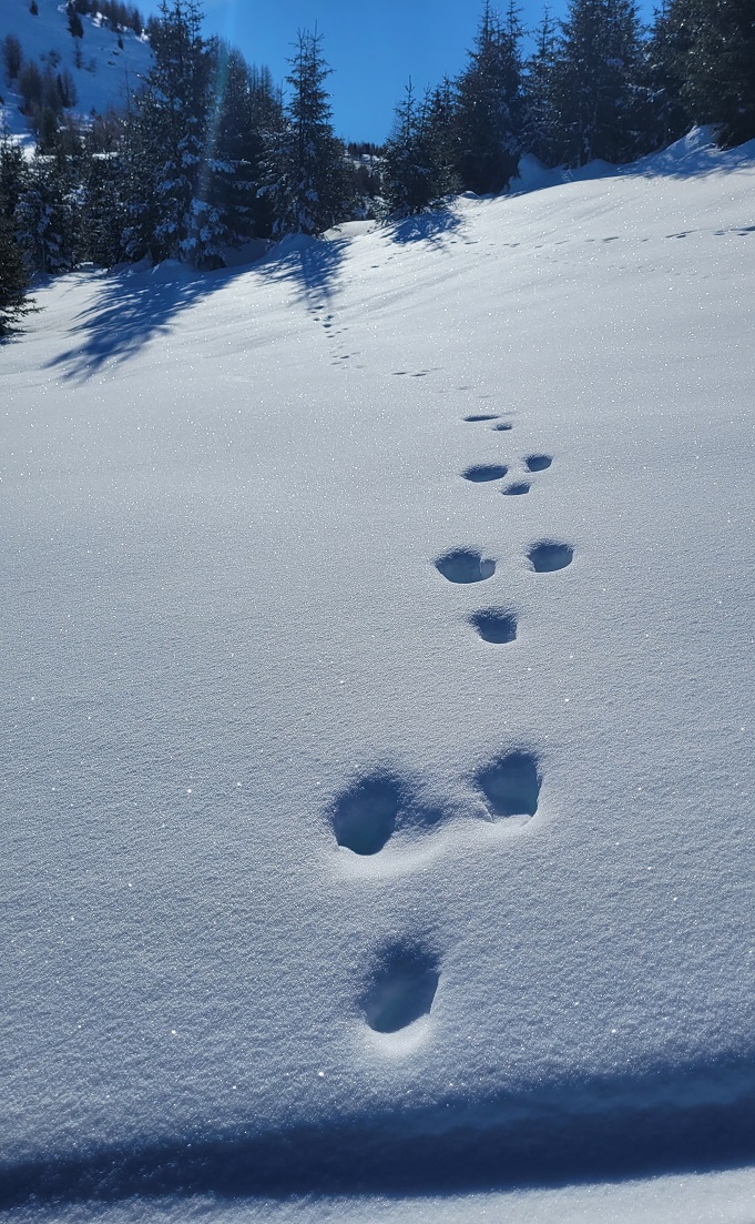 Puista oli karissut jäätynyttä lunta, kuin kristalleja, hangen päälle. Jänisten jälkiä näkyi myös siellä täällä, mutta yhä vieläkään en ole tavannut ainuttakaan pitkäkorvaa Sveitsissä.