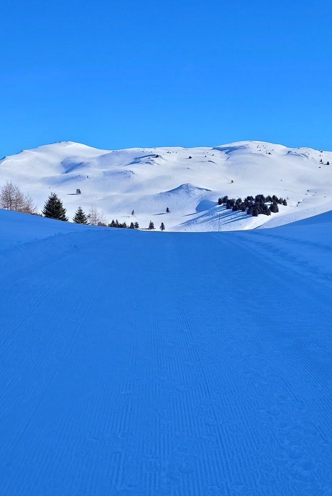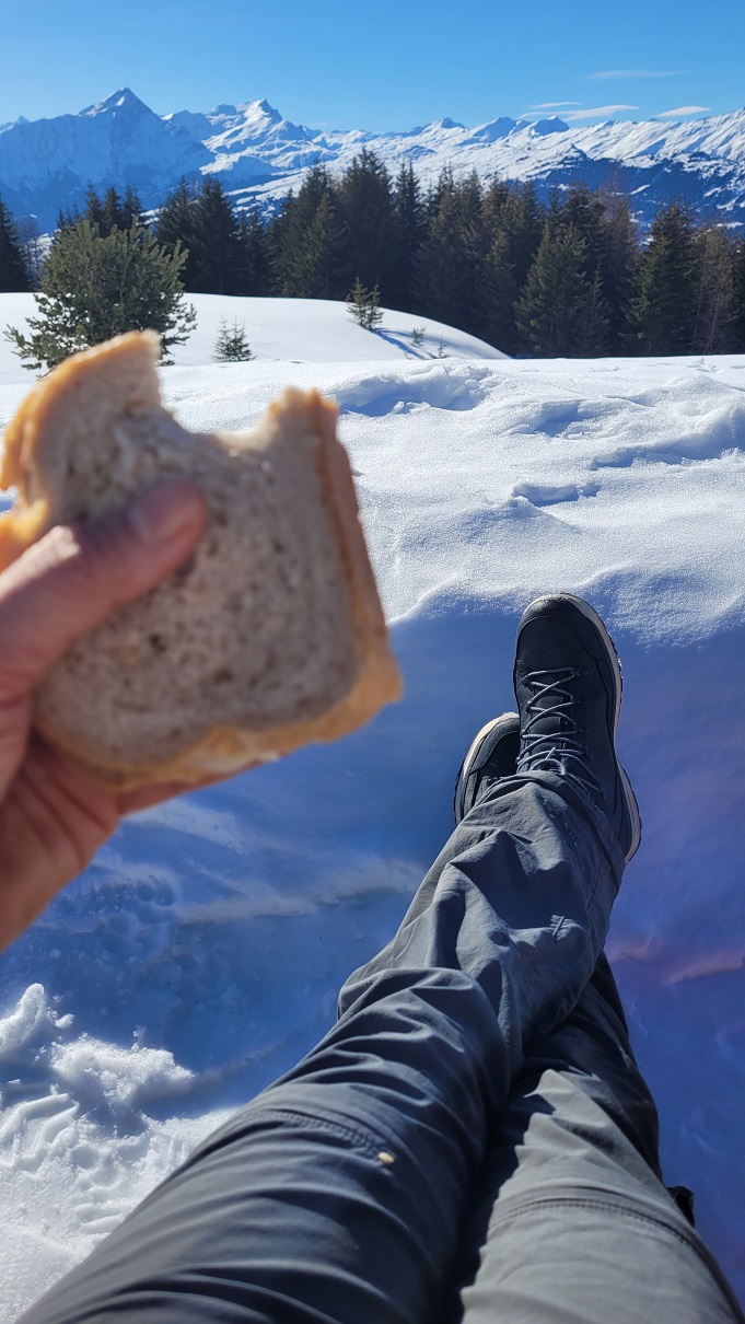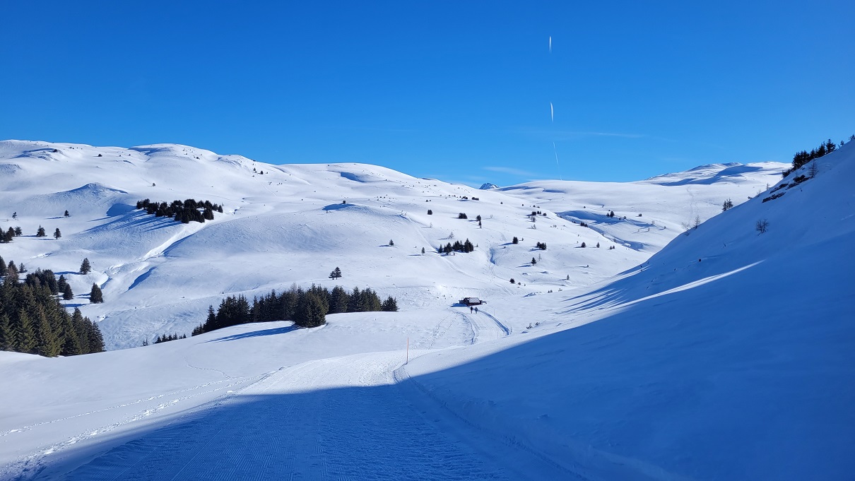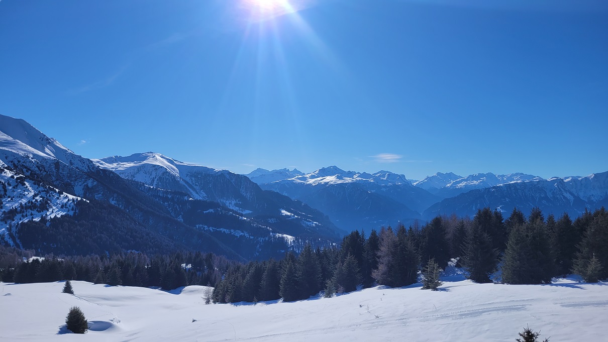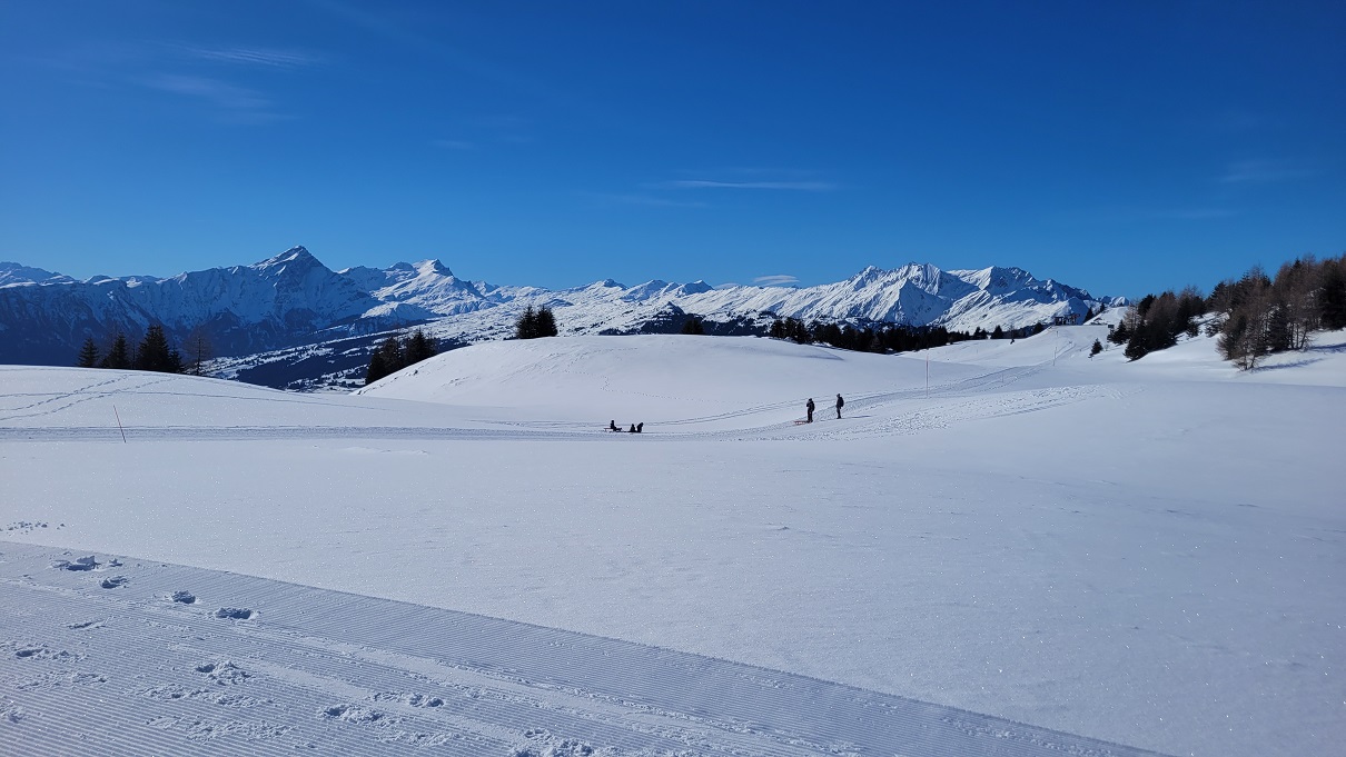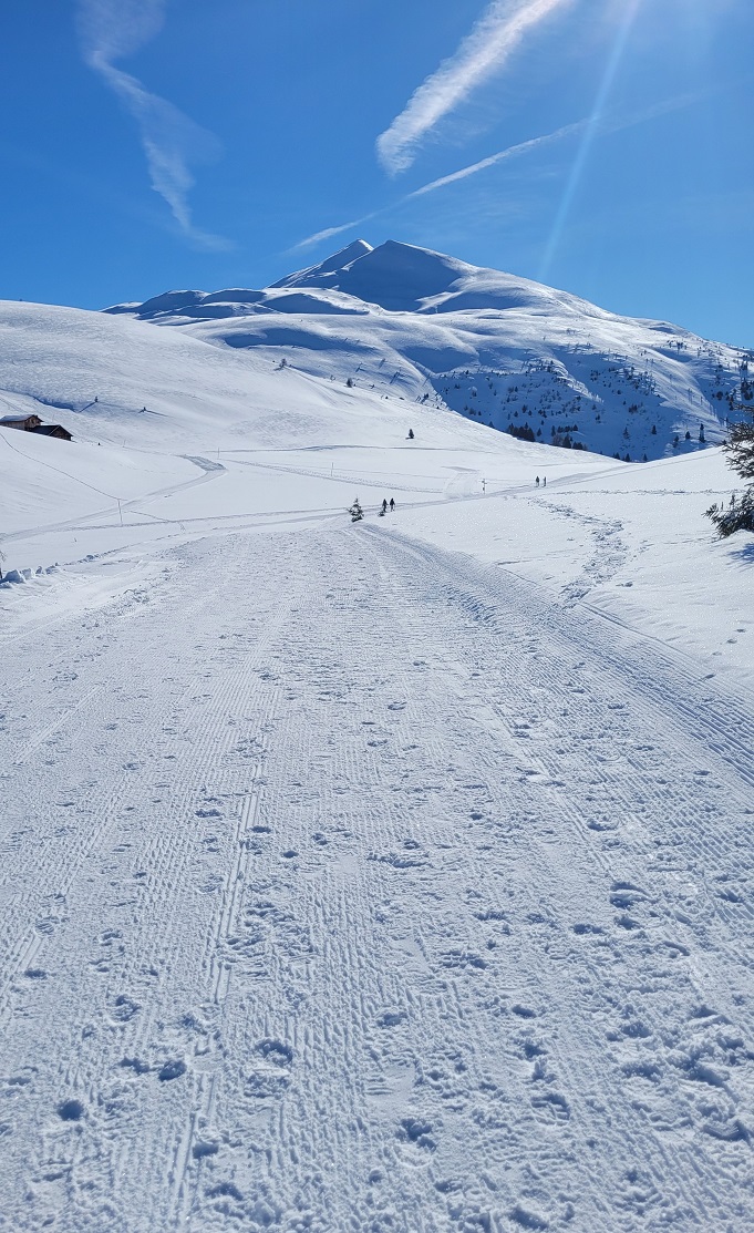 Ainut näkymä varsinaiseen sivilisaatioon on melko alussa alas laaksoon Churin kaupunkiin ja lopussa toiseen suuntaan, mitä siellä sitten onkaan. Muuten edessä oli valkoista ja sinistä, kimmeltävää lunta ja taivasta. Ja bongattiin myös huippuset, jotka ovat selvästikin sveitsiläinen versio Lapin Nattasista, jos tiedätte.