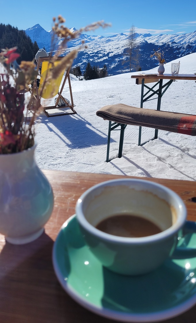 Yläasema nimeltä Mutta oli pieni tönö kukkulan huipulla. Siihen jäätiin hetkeksi siristelemään silmiä. Vuoria, valkoista, ihanaa valoa, sinistä ja kirkkaan aurinkoista. Kotona olo oli kuin perunanidulla, kalpea ja nuutunut. Juuri tätä piti saada. Raikasta ilmaa, lumen narsketta ja säteitä.