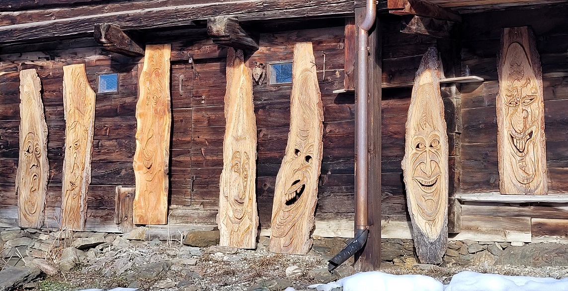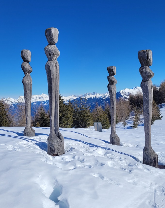 Kuplahissillä selvisi, että tämä on tosi pieni pieni paikka. Käveltiin suoraan hissiin, ei jonoja, ei ihmispaljoutta. Ylhäällä Feldisin kylällä, 1470 metrissä, on varmaan ollut talvea, koska oli hiihtokoulukin. Mutta nyt ei näkynyt lunta kuin läikittäin, vaikka on helmikuu. Sen sijaan puuveistoksia oli pitkin poikin. Taiteellista väkeä nuo feldisläiset.