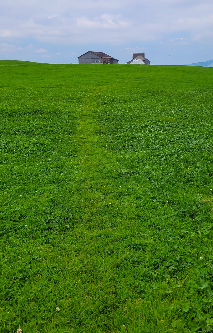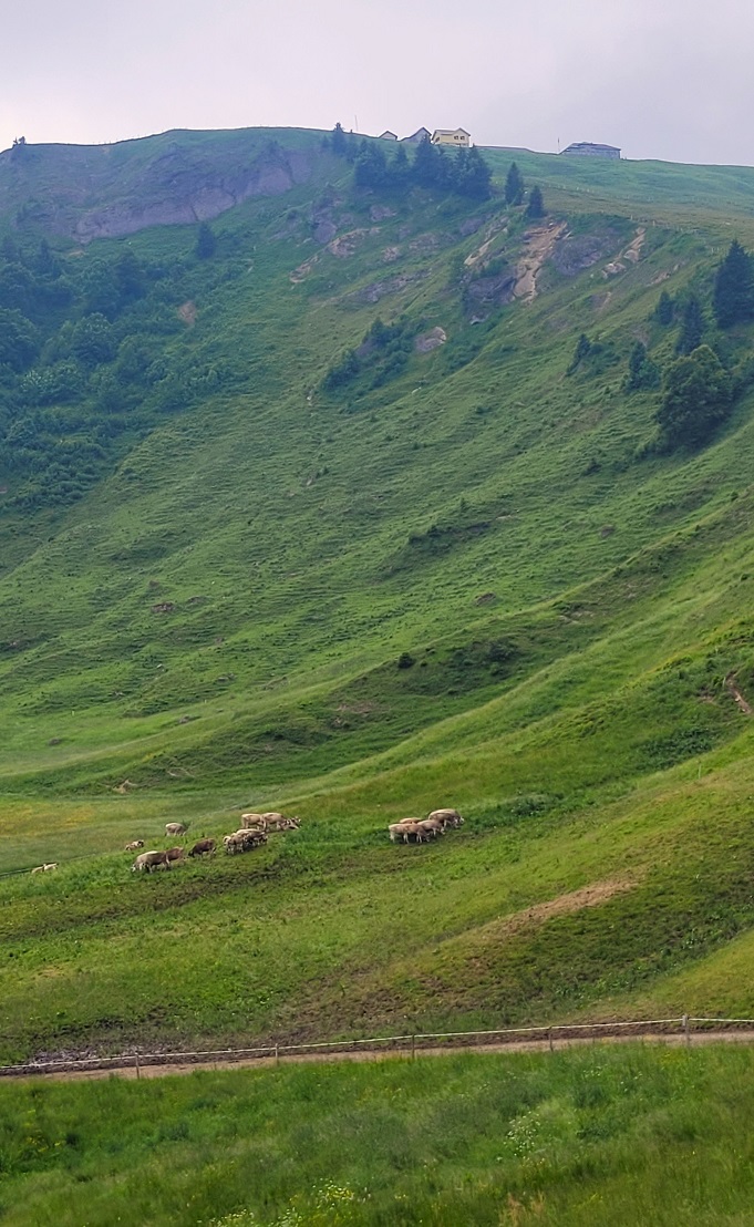 Lämpimän juustopaninin ja vahvan kahvin vahvistamana olin valmis kohtaamaan jopa ne luvatut lehmälaitumet. Ukaasit oli selkeät, matkalla on äitilehmiä vasikoineen ja ne pitää kiertää hiljaa ja kaukaa. Kuuntelin kellon kalketta – nyt se tulee. Kilahdus toiselta suunnalta – apua, miten tässä käy. Maalalilin mielessäni skenaariota kapeasta polusta, jolla märehtii kantturoita niin, etten pääse ohi ja joudun kipuamaan takaisin lähtöpisteeseen. Lopulta oltiin jo lähes perillä, kun tie kulki lehmien ohi. Lehmien, jotka olivat aitauksen takana.