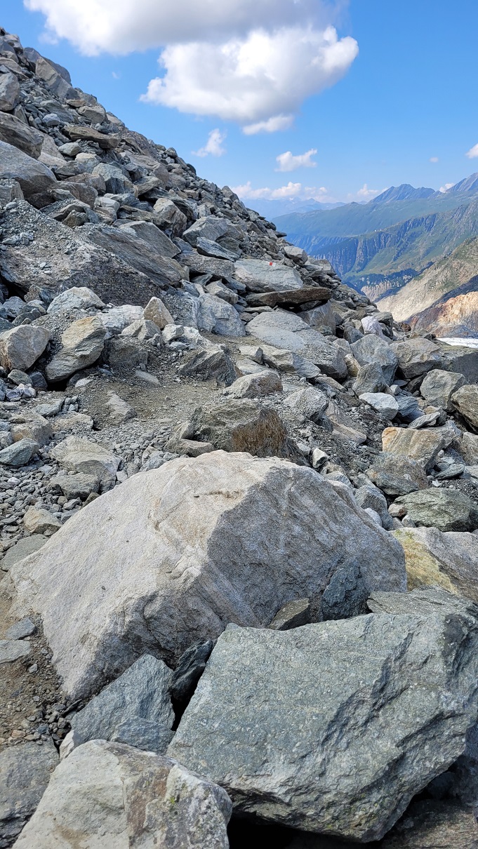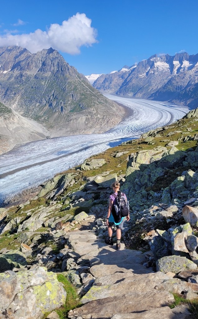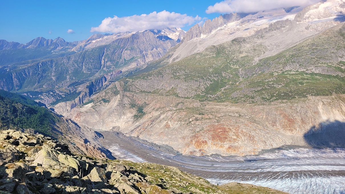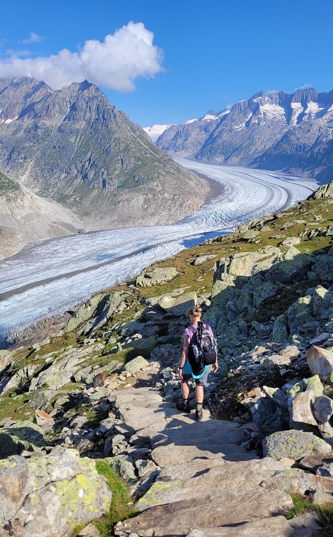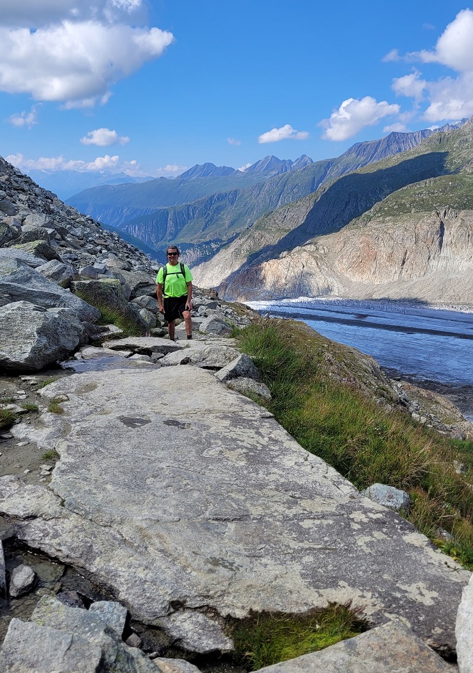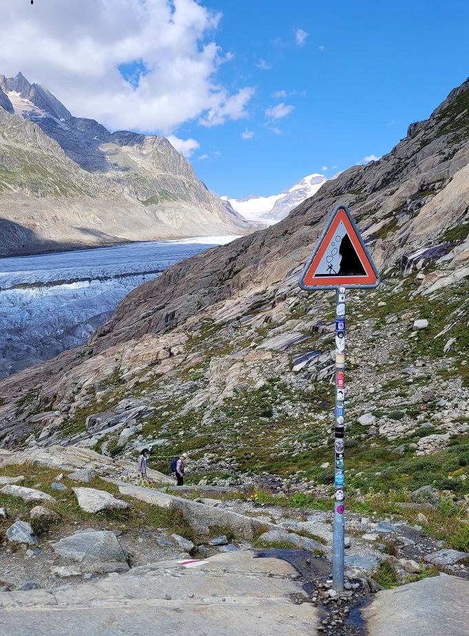 Päivityksenä Reppu ja reitti, patikkapolkujen Sveitsi -kirjaan reitti ei siis lähde enää Bettmerhornin näköalatasanteelta oikealle, se pätkä on kivivyöryjen jälkeen suljettu. Sen sijaan ensin kuljetaan vastakkaiseen suuntaan, jonka jälkeen kilvet ohjaavat jäätikön reunaan.
