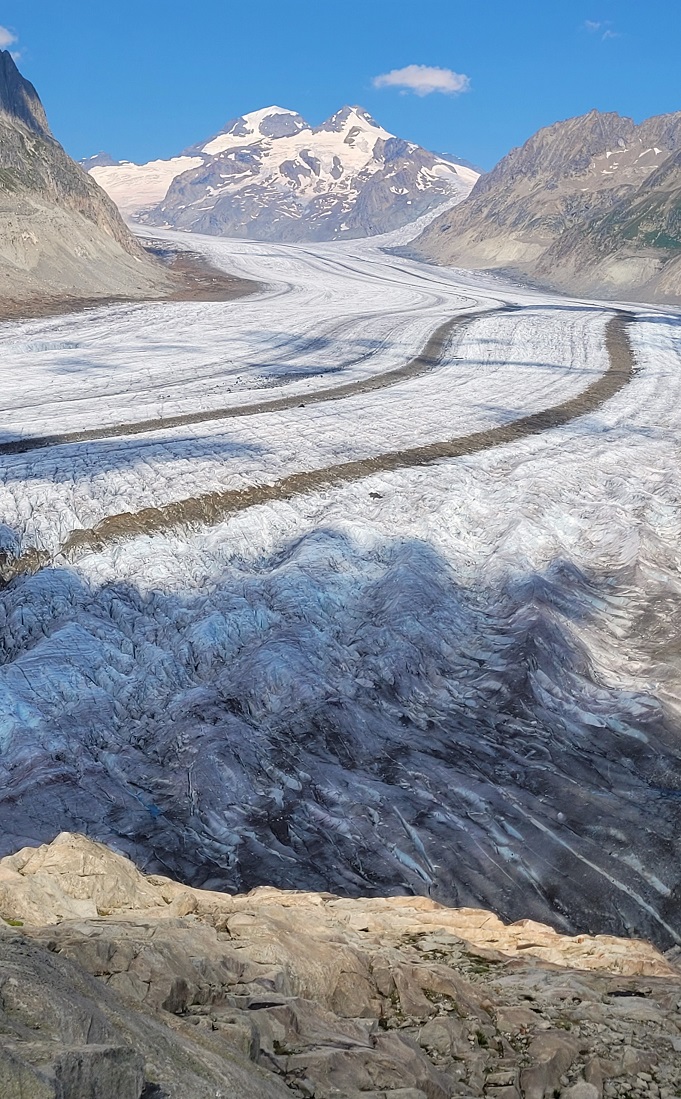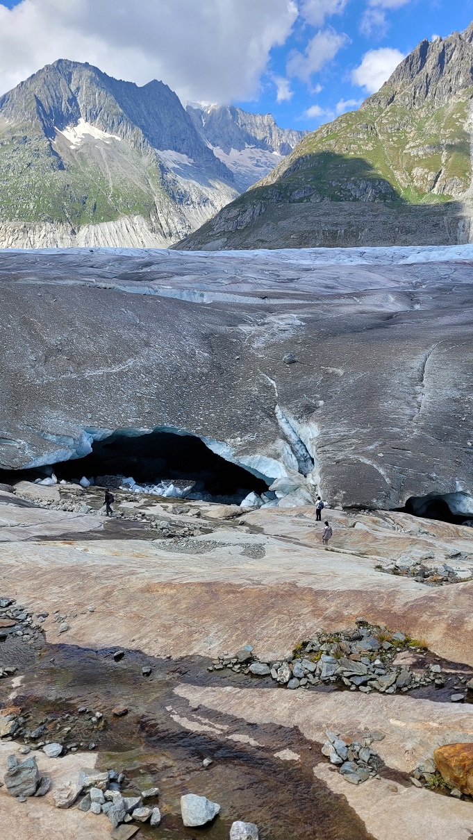 Kun sain henkilökohtaisen katastrofini hoidettua, pääsin keskittymään itse asiaan. Päällimmäisenä on tietenkin se hurja muutos jäätikön massassa, ilmiö, jonka vertaista en ole luonnossa koskaan nähnyt. Aletsch on vetäytynyt jo 1860-luvulta, mutta 24 vuotta sitten jääkerros ulottui kymmeniä metrejä korkeammalle ja tänään jo ensimmäisessä kurvissa näkyy vain kuraista vettä. Häntä on lyhentynyt entisestään.