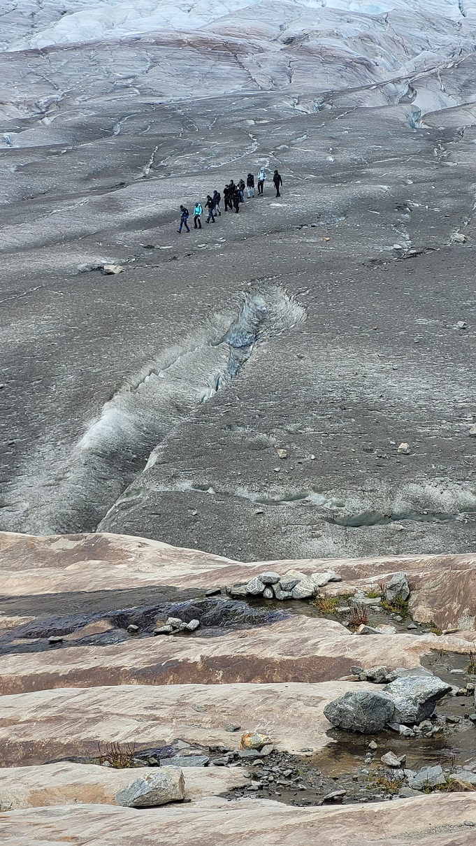 Jäätiköllä oli useita retkueita oppaan kera turvaköysineen ja piikkikenkineen; nyt sille oli helppo kivuta. Vuosia sitten jäisen kerroksen päälle pääsi vain toisesta reunasta. Muutama uskalikko lähti kuvailemaan itseään jäätikölle ilman mitään erityisvarusteita, ihan vain tennarit jalassa.