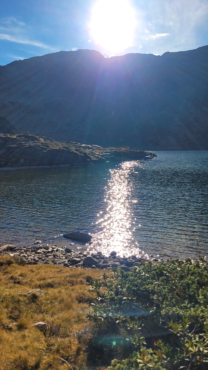 Vähän alempana, Murgjärven rannalla, ei tuulesta ollut jälkeäkään, aurinko lämmitti leppeästi ja lihakset rentoutuivat, vesi liplatteli vaimeasti ja jostain kuului juttelua. Lisäsin rasvaa ahavoituneisiin huuliini ja mietin, että voisin alkaa mainostaa Fishermans Friend -pastillien alppiversiota, Ricolaa. Kuinka vuoriston yrtit siloittaisivat jopa ankarassa kelissä rohtuneet huuletkin.