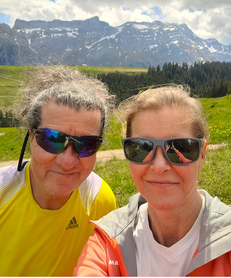 Huipulle nousun loppuvaiheessa ärhäkkä tuuli töni askelta ottaessa. Pikkuisen lisää voimaa ja olisin ollut kumossa kupeessa. Kronbergin huipun terassilla yritettiin piiloutua lasiseinämän taakse suojaan, mutta auringosta huolimatta hytisytti. Teki mieli jätskiä, tilasin silti vähemmän kylmää Schlorzifladenia, piirakkaa, jonka täyte on kuivatuista päärynöistä tehtyä pyrettä. Ei ehkä ihan lempparini, mutta paikallinen ja energiatasot palauttava. Terassille kaikui musiikkia hissiaseman puolelta. Pari miestä soitteli Schwyzerörgeliä, täkäläistä pieni hanuria ja jodlasi voimalla. 12 pistettä täysillä eläytymisestä!