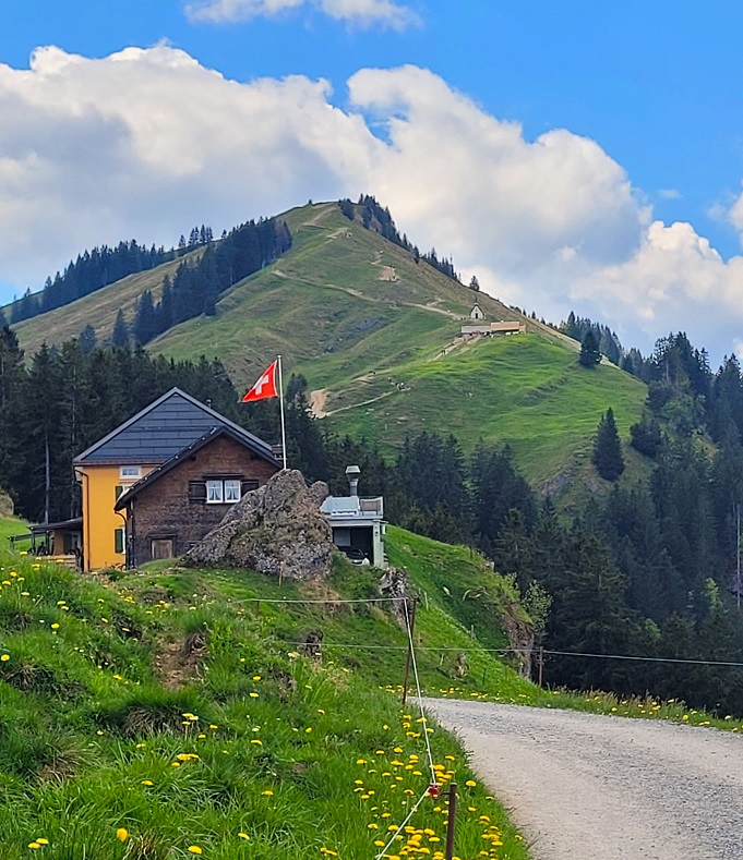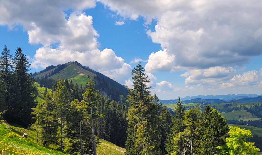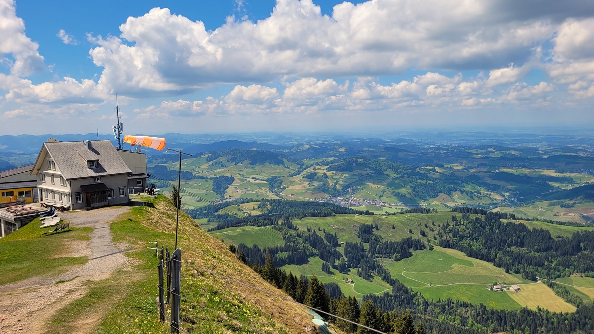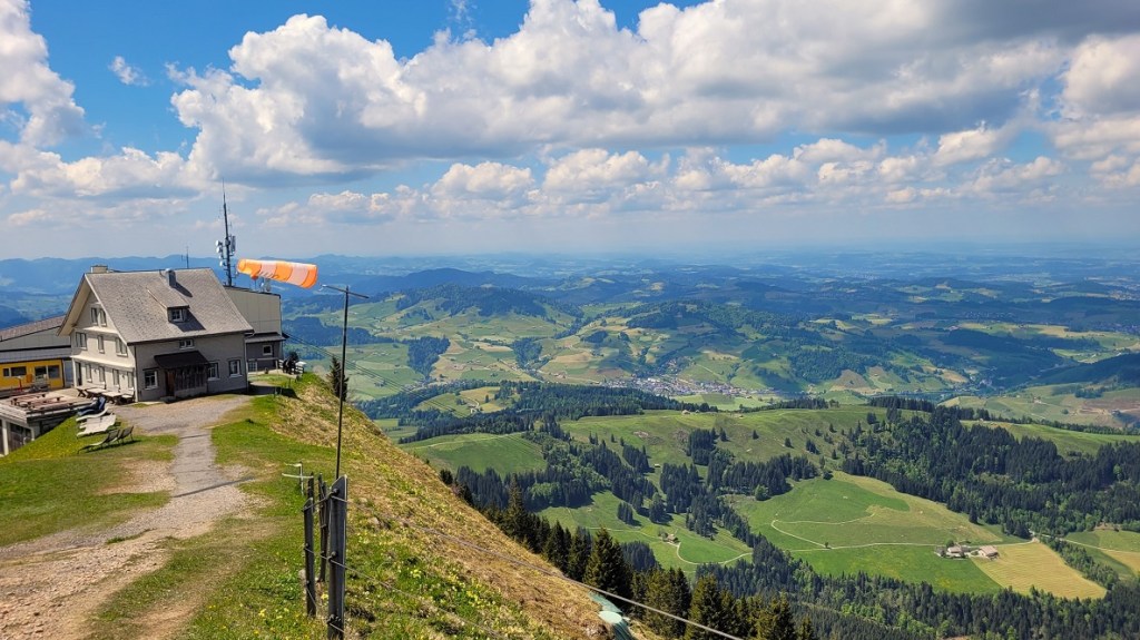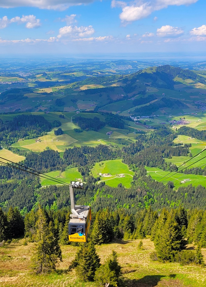 Appenzell on kauniisti ja vihreänä kumpuilevaa itäistä Sveitsiä, ehkä yksi lempipaikoistani päiväretkille. Kronbergiltä näkyy joka suuntaan, Bodeninjärvelle ja Saksaan, Itävaltaan, Säntis- ja Hoher Kasten -vuorille. 7 km oli juuri sopiva edellisen päivän hurlumhein jälkeen. Matkalla tallattiin juurakkoista metsäpolkua, niittyä, portaita sekä leveähköä maalaistietä. Lähes 800 korkeusmetriä takasi, että tuli hoidettua aerobinen treeni samalla.