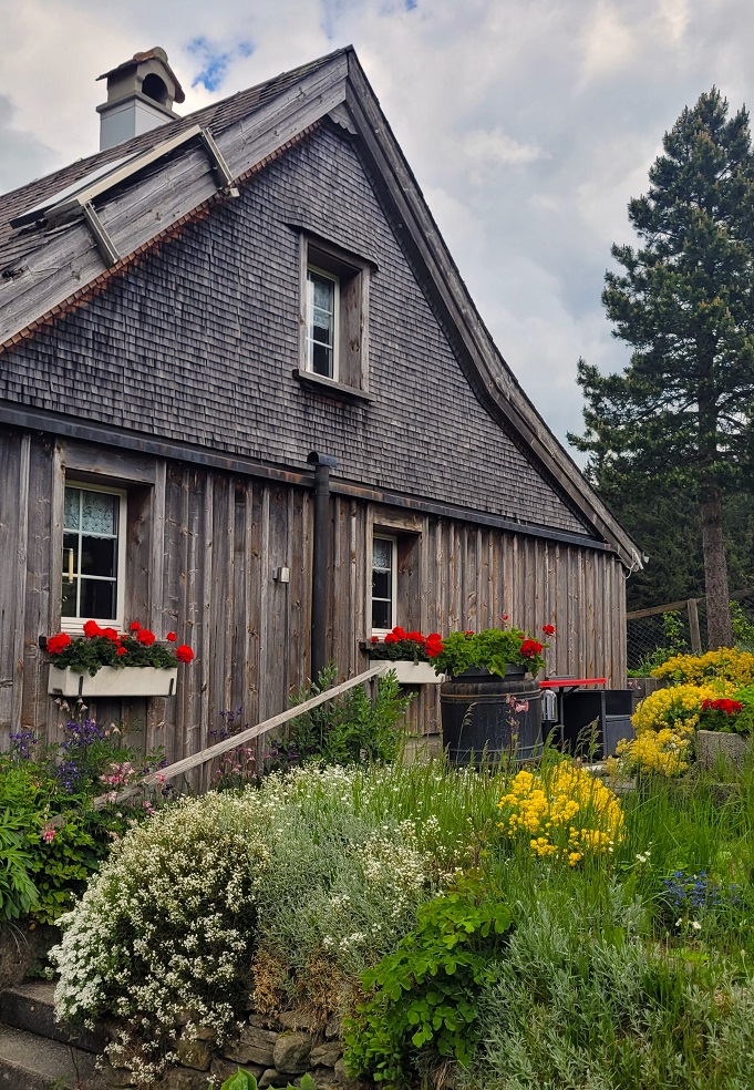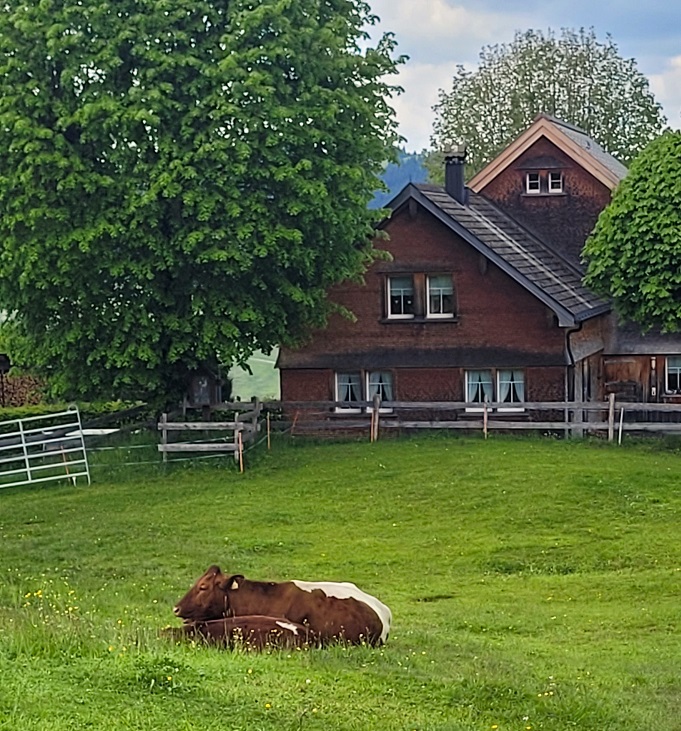 Appenzellin lehmät vasikoineen eivät välttämättä ole aitauksessa, mikä saa aina vähän varpailleen. Meidän kohtaamat lehmät olivat kuitenkin aivan rauhassa omissaan, nauttivat heinikon suojasta ja pilkahtelevasta auringosta.