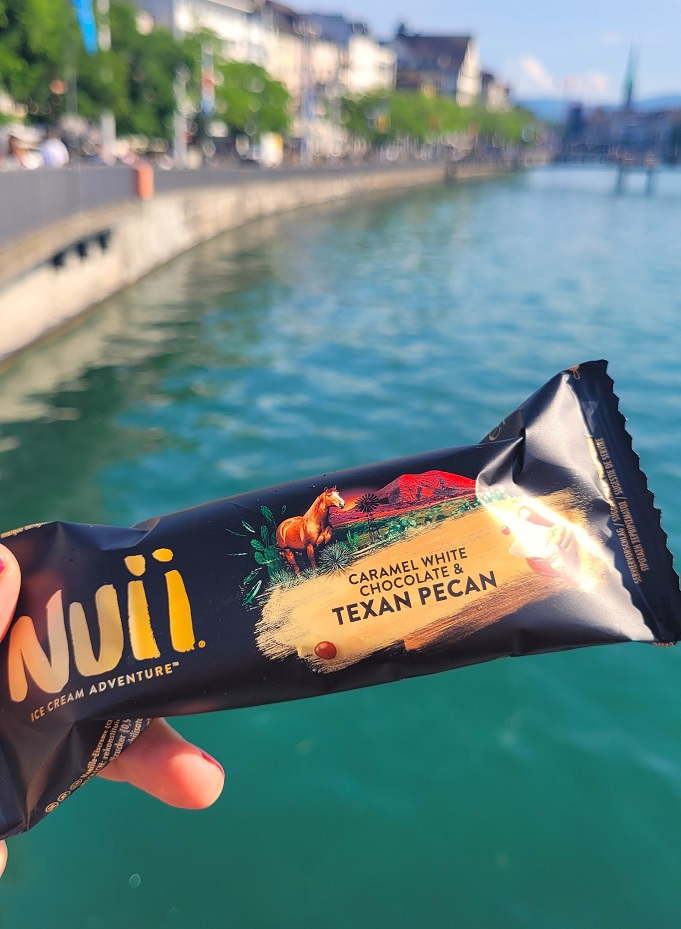 Ja koska edellisen reissun perusteella tästä on tullut jo perinne, josta en luovu, otin Zürichissä hangottelematta vastaan jätski nro 2:n eli mainosjätskin. Pähkinäinen ja karamellinen, kymmenen pistettä.