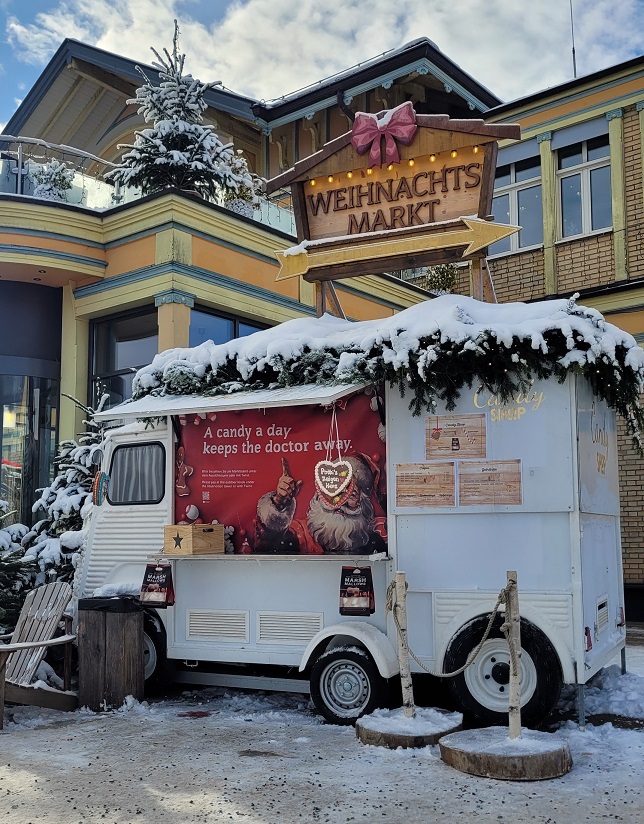 Olin suunnitellut juovani kupposellisen kuumaa kaakaota ja syöväni ehkä jotain pientä, jotta energiaa riittäisi joulutorilla kiertelyyn. Tori olikin vain kolme hotellin huoneen ikkunaa, jotka oli muutettu myyntikioskeiksi. Koruja, kynttilöitä, tonttuja. Se oli niin nopeasti nähty, että maisemakuvien jälkeen olin valmis palaamaan alas Zürichiin. Kaalilaatikko ja kahvit kotona alkoi tuntua parhaalta vaihtoehdolta ylihinnoiteltujen racletteannosten ja glühweinin sijaan.