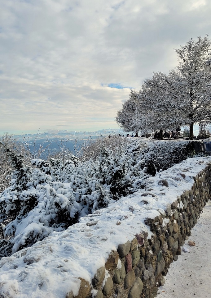 Huipulla oli lapsia pulkkien kanssa, mikä oli kyllä lievästi liioittelua. Mutta sveitsiläinen kaupunkitalvi on niin hetkellinen, että kaikki otetaan irti, myös huurteisesta mäestä.