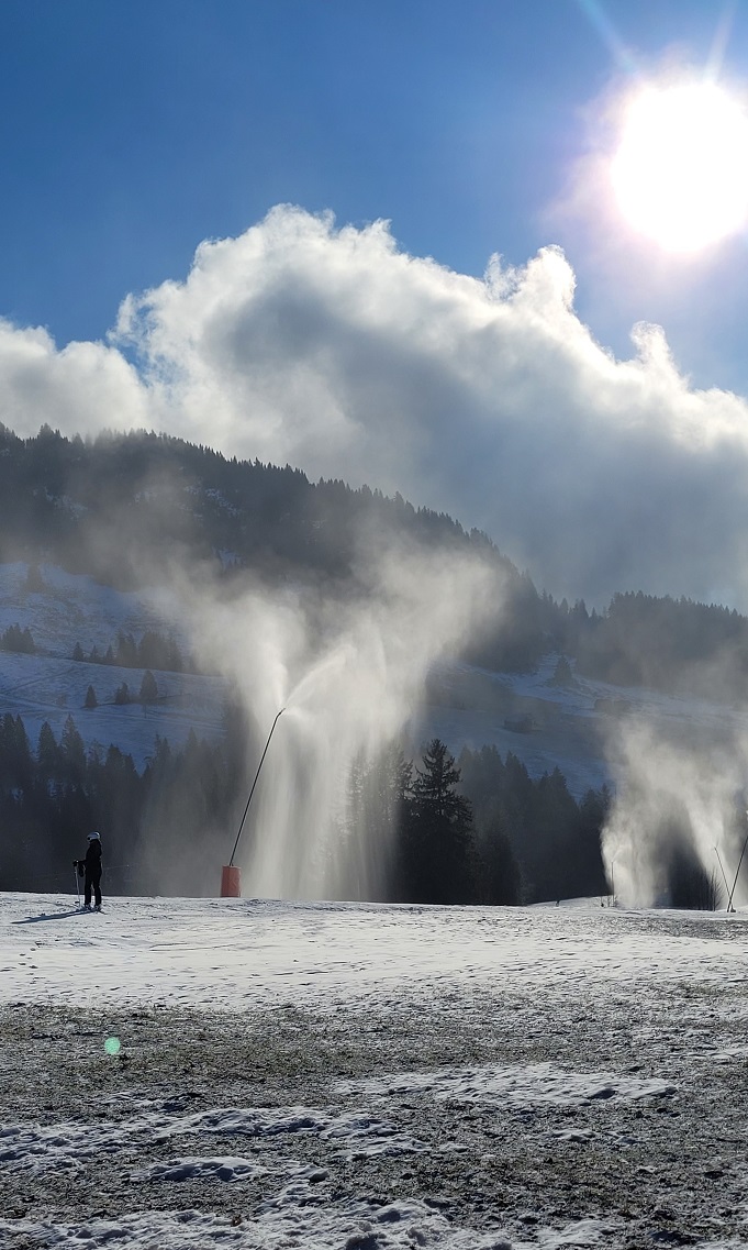 Tiesin, ettei lunta juuri ole, mutta ruohoinen polku ilman minkäänlaisia jään rippeitä tuntui kengän alla ihmeelliseltä. Vieressä suihkutettiin lunta rinteeseen, laskettelua treenaaville lapsille.
