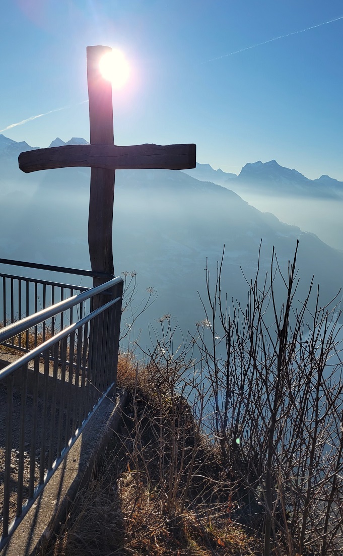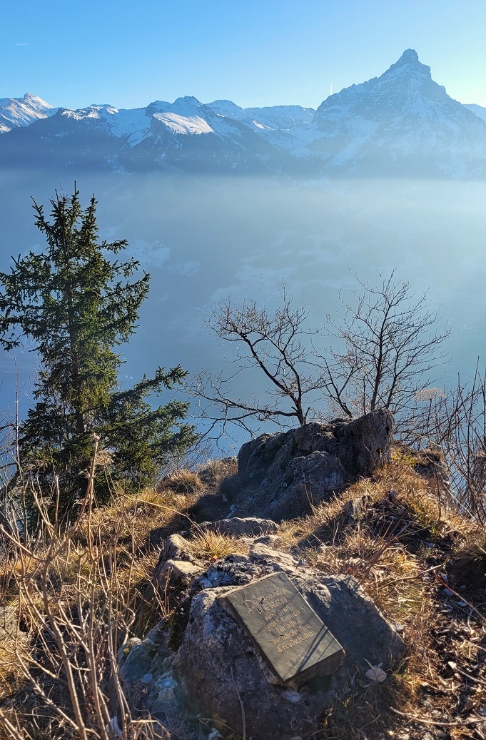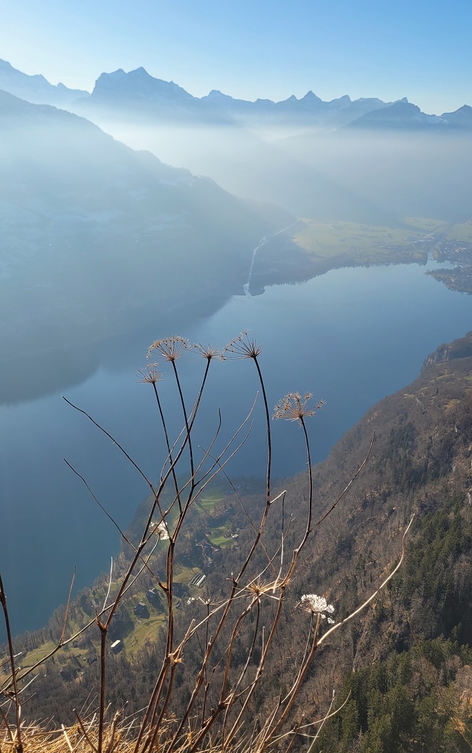 Aurinko tuntui viikkojen sumun ja pilvisen sään jälkeen kasvoilla aivan uskomattomalta. Näin kesäisissä olosuhteissa reitti oli kevyt ja siksi jatkettiin vielä toiseenkin suuntaan, Chapfin näköalapaikalle. Walensee oli haaleamman sävyinen kuin kesäsäässä, mutta vuorten puolivälissä roikkuva usva pehmensi maiseman utuisen maalaukselliseksi. Penkeillä istui väkeä nauttimassa paisteesta, lukemassa kirjaa. Oli hetki rauhoittua ennen seuraavaa vuotta.