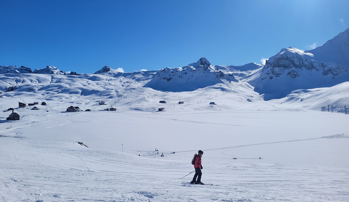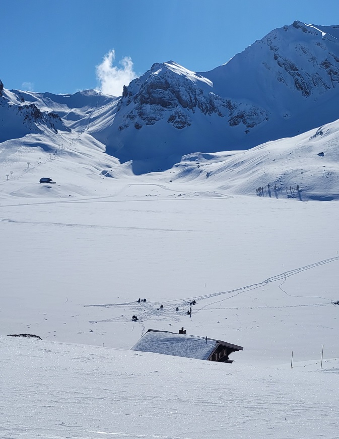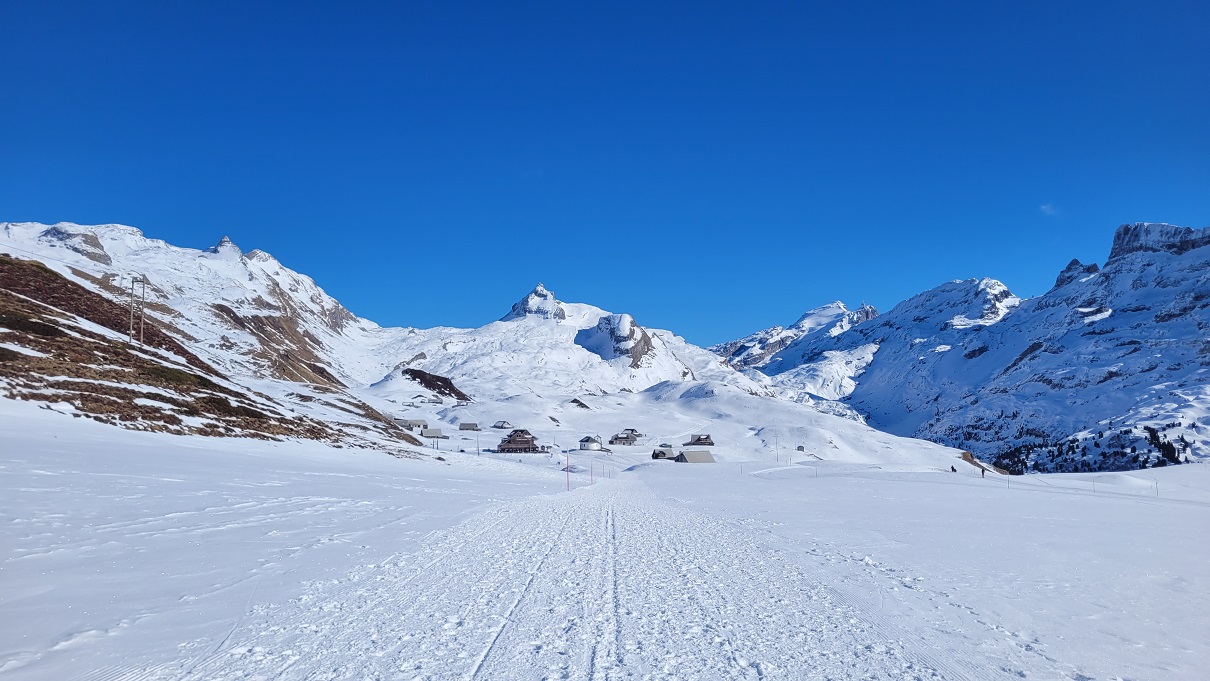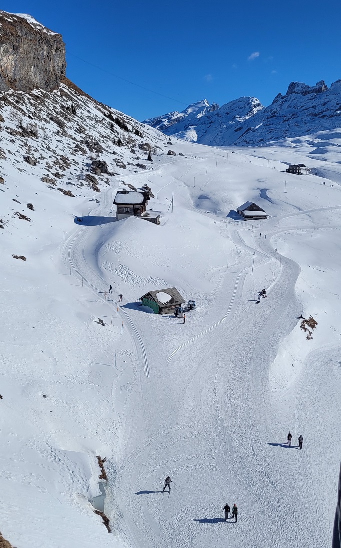 Melchsee-Fruttissa tuntui, että ollaan polttopisteessä; aurinko paistoi täysillä, valkoista oli alla ja ympärillä. Säteet tunkeutuivat aurinkolasien allekin ja aurinkovoidetta piti sivellä kämmeniin ja käsivarsiin, sillä vaatetta piti kuoria nopeasti. Lumipöperöisessä mäessä tuli nopeasti todella lämmin.