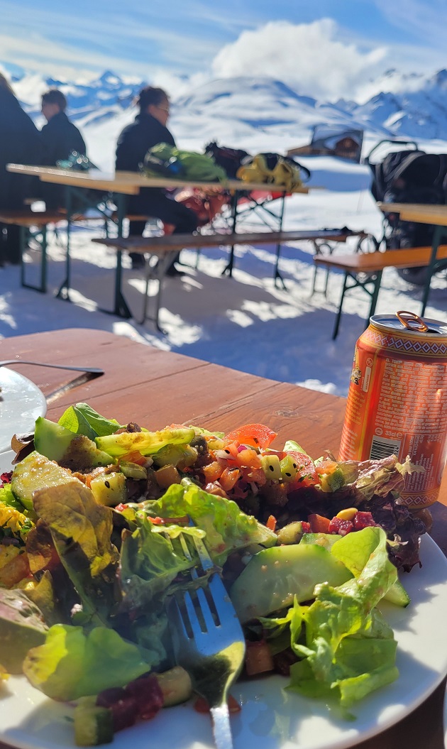 Retki meni vanhan kaavan mukaan, suuntana reitin ääripään kuppila ja Graubündenin ohrakeittoa, alppimakarooneja ja thaicurry, jota ei ehkä sittenkään lueta perisveitsiläisiin ruokiin, vaikka sitä aina täällä onkin tarjolla. Perillä pyyhittiin jäät penkiltä ja istahdettiin tauolle aurinkoon. Naapuripöytään tuotiin lasipikarissa kaakaota valtaisalla kermatötteröllä, mikä näytti ihanalta, mutta ruuan jälkeen liian tömäkältä. Otettiin sittenkin vain pelkät kahvit.