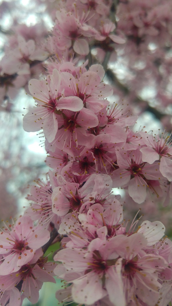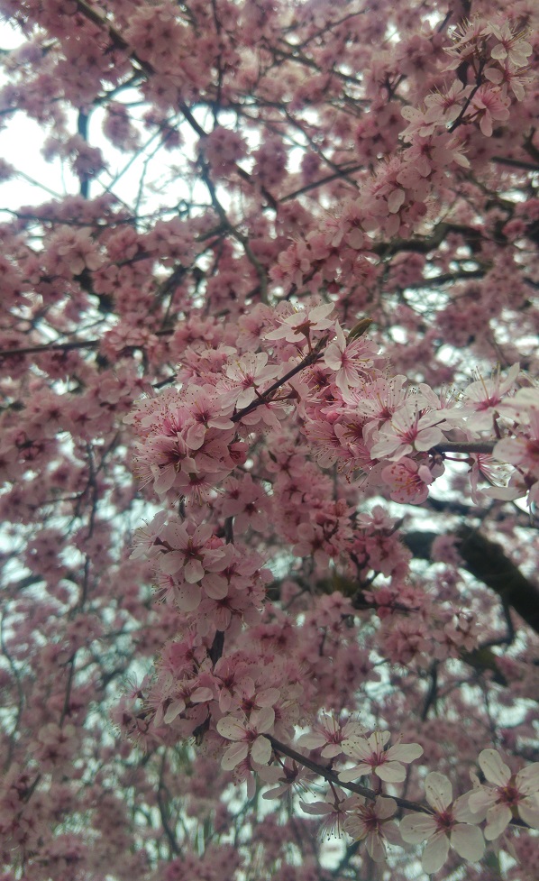Vaaleanpunainen yllätys löytyi matkanvarrelta, kohdasta, jota en ollut aiemmin edes rekisteröitynyt. Parkkipaikan ja junaraiteen välistä. Julmetusti kukkia, tiheässä ja tiiviisti. En tiedä minkä sortin kirsikasta on kyse, mutta ihailin sitä suunnattomasti ja iloitsin sattumasta.