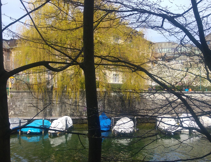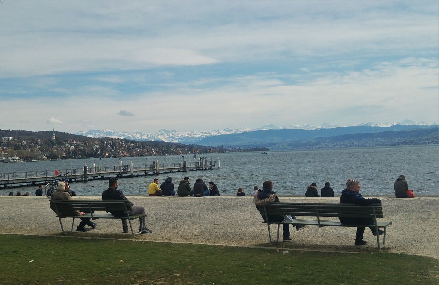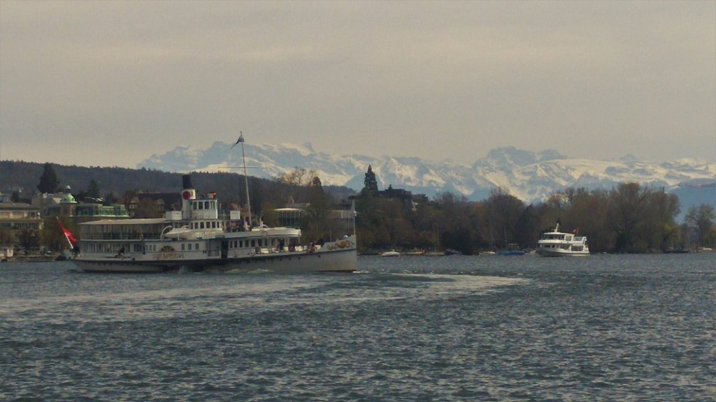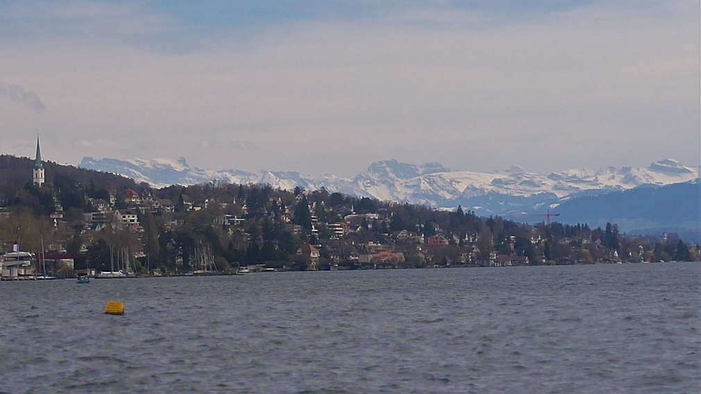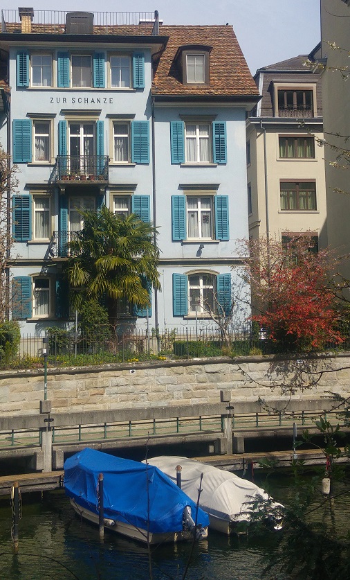 Olimme kuin vieraassa kaupungissa, ratikat vievät aina samoja teitä, autolla hurautetaan ulos tai sisään pääväyliä käyttäen ja jalankin menot ovat samoilla seuduilla. Ylitämme Sihl-joen ja löydämme synagogan. Suunta järvelle päin on selvä, mutta missä kohti tarkemmin olemme, lienee vain googlen tiedossa. Schanzengrabenilla, Zürichin muinaisjäänteen reunalla, siis vallihaudan sivussa, alkavat suunnat selvitä. Vesiväylän päässä siintävät nimittäin Alpit.