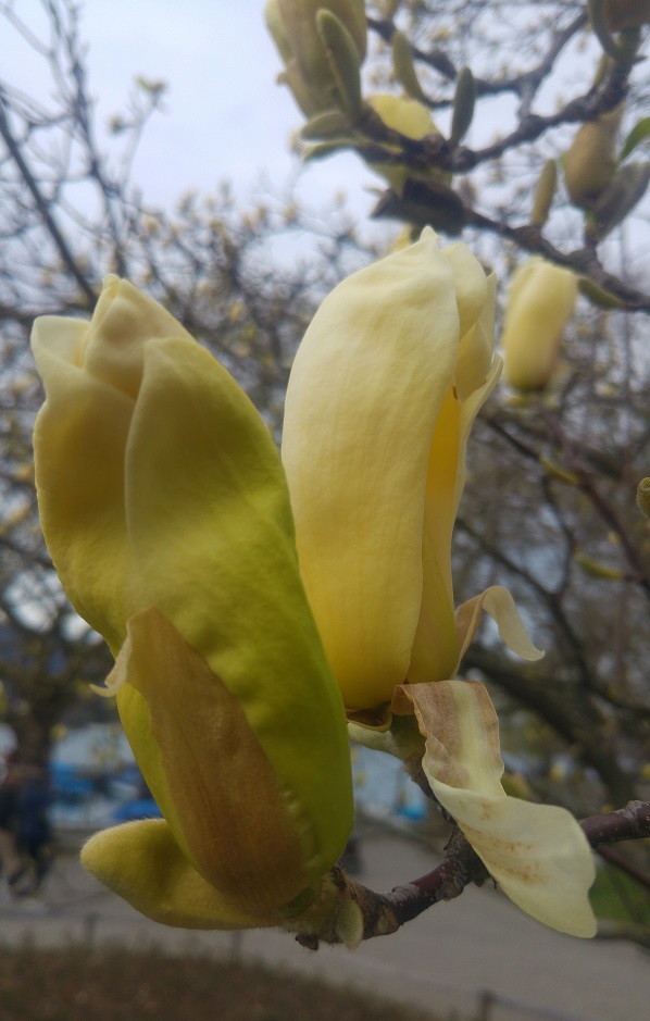 Magnoliat ovat myös vauhdissa, ne ikisuosikkini. Zürichin rantapromenaadin toisessa päässä Zürichhornissa keltainen isokukkainen oli vielä avautumaisillaan. Karvaiset, vaaleanruskeat nuput olivat antaneet periksi, longahdelleet, taipuneet, yrittäneet pitää kiinni asennostaan. Keltainen oli ylväänä ulkona, muttei vielä täydessä loistossaan.