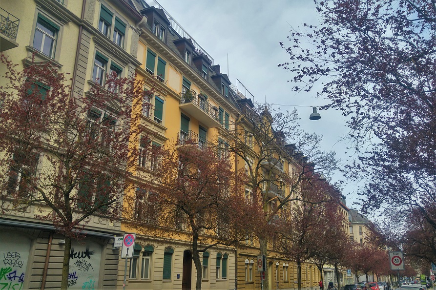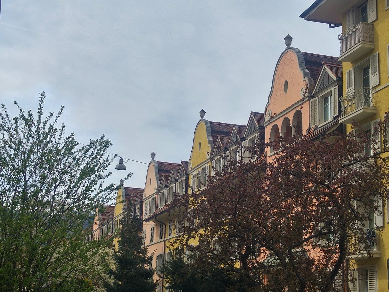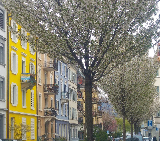Kävelimme kadun toiseen päähän, Idaplatzin paikkeilla risteävällä kadulla kukkivat yhä valkeat kirsikat. Sivukadulla huomasin talorivistön pyöreähköt linjat. Kukapa arvaisi, että nämä vanhat kaupunkiasumukset ovat jääneet kaupungin jalkoihin. Vanha Wiedikon on mahtanut olla upeaa aluetta. Rinteessä katselee keskustaan suuria villoja. Väliin jäävän niityn alareunassa ollaan piknikillä. Tänne ei kuulu läheltä pyyhkivä moottoritie.
