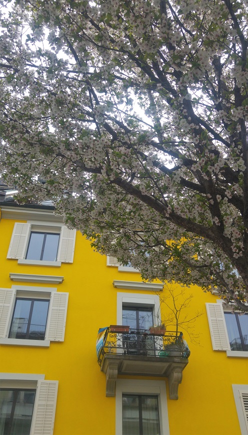 Seefeldin kaupunginosassa, juuri siinä kaupungin rakastetuimman pizzerian edessä, loisti kirkkaankeltainen seinä ja edessä valkoisten kukkapuiden rivistö. Harmaana talvipäivänä olen käynyt katsomassa keltaista seinää, nyt katu näytti vieläkin kukoistavammalta.
