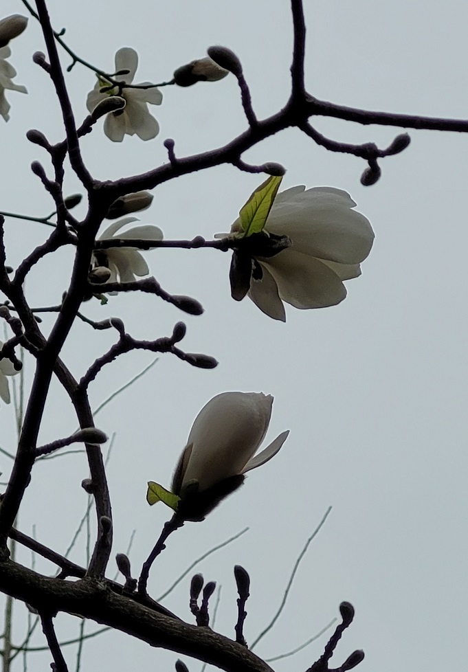 Puistossa valkoisten magnolioiden rivi – niiden aikaisten, joiden terälehdet ovat sikin sokin ja siksi niin viehättäviä – tuoksui hiekkakäytävän yllä kuin parfyymipilvi. Kukat tuskin erottuivat valkoista pilvitaivasta vasten, vain profiilit erottuivat kuvissa.