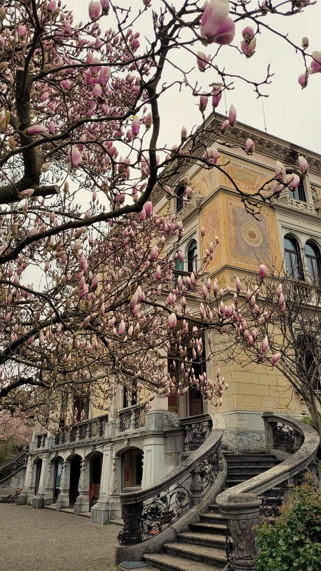 Villa Patumbahin puisto Zürichissä vetää kukkabongaajia puoleensa juuri näihin aikoihin. Kamerat räpsyy jo sen edustalla, missä kirsikka kukkii diivamaisesti keskellä kaupunkimaisemaa. Valurautaportista puikahtaa hymyileviä ihmisiä, keväthuuman luomamia.