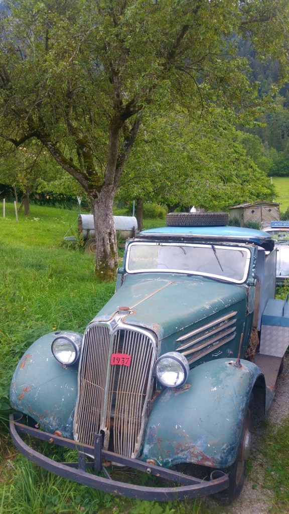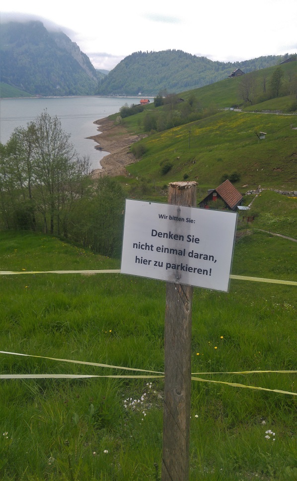 Opastusten mukaan Obertschappinasta piti löytyä parkkipaikka. Kyllä, mutta siitä oli vielä monta kilometriä kiermuratietä ylöspäin polun alkuun. Hiihtohissi, jonka kuvittelin olevan istuttava, olikin t-hissi, joten se siitä. Postibussi olisi ajanut joskus tuntien päästä, joten siitäkään ei ollut apua. Autoon ja yhä ylös kohti Obergmeindea.