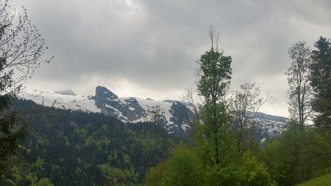 Korkeimmat huiput ovat pilvien alla; välistä pilkottaa lunta. Vaikka tietä pitkin silloin tällöin pöräyttää mopo tai autokin, on rauhallista.