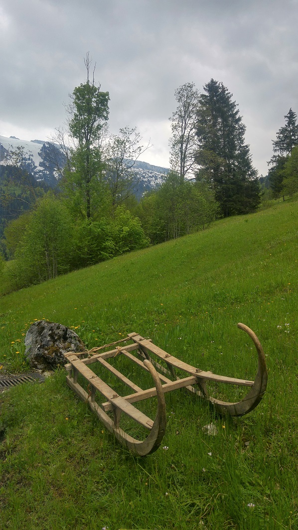 Laakso oli upea, samoin olosuhteet, enhän koskaan olisi varta vasten lähtenyt reitille, joka ei vielä ole sula. Gasthausin terassilla törmäsimme lumikenkämieheen. Hän oli vetänyt parrut köyden perässä hissiltä tänne asti ja rakenteli niistä nyt hyllyä tai muuta kalustetta terassille. Ilmeisesti paikan isäntä. Kahvit tuonut toinen tyyppi kertoi, että kesäkuun alussa lunta oli vielä kaksi metriä. Tavallisesti tähän aikaan laaksossa tepastelevat lehmät.