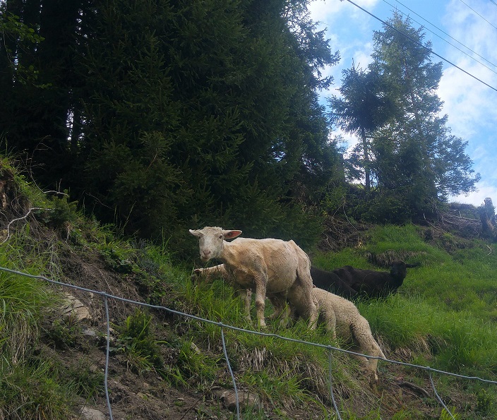 Spielbodenalpin kohdalla kurvataan pihamaalle kahville ja mansikkapirtelölle. Rouva tarjoilee rakennuksen ikkunasta. Vähän pitemmällä meille määkivät vuohet.