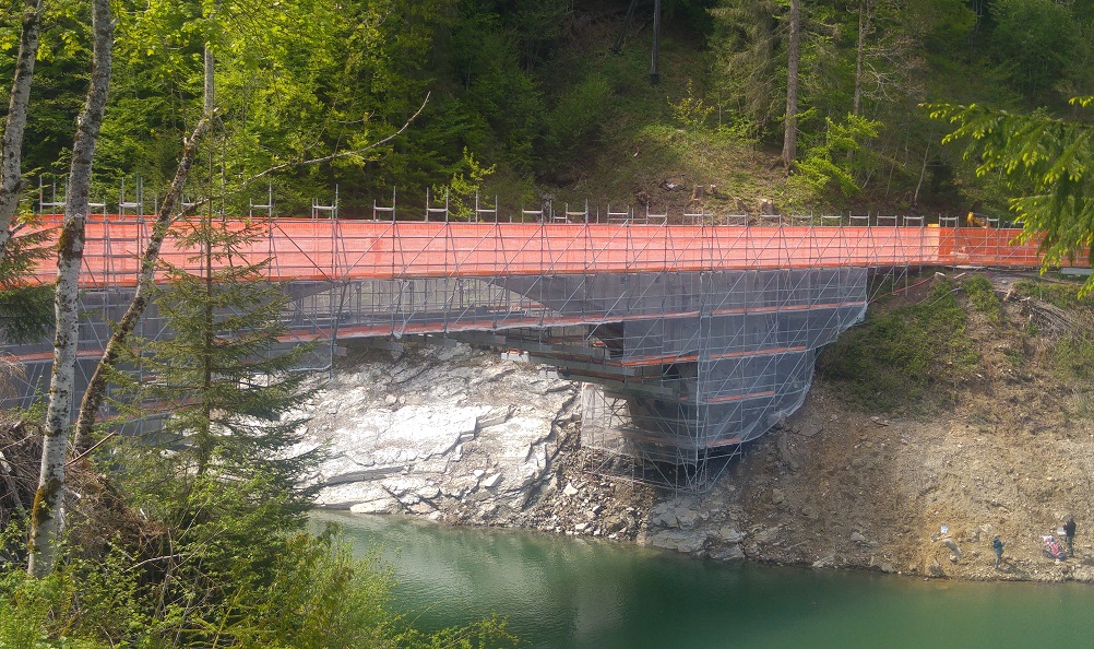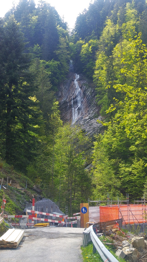 Juuri ennen Wägitalerseen padon siltaa meitä odottaa toinen, pienempi silta työmaatilassa. Sivussa oleva putous saa vain nopean huomioinnin, sillä on pakko miettiä millä ilveellä saan itseni ylittämään tutisevat metallilevyt, jotka on pantu meitä jalankulkijoita silmälläpitäen. Jokaisella askeleella levy notkahtaa ja toinen heilahtaa.