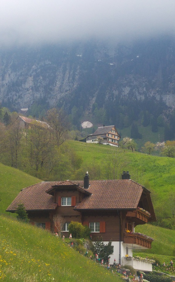Huttu peittää vuoristojonon niin, että horisontissa on vain aavistus teräväkärkisistä ja lumihuippuisista. Mutta siellä ne ovat. Täältä niitä on hyvä katsella. Tiedetään vuorten olemassaolosta muutoinkin, nähtiinhän ne viereiseltä ja Zürichin korkeimmalta, Schnebelhornilta.