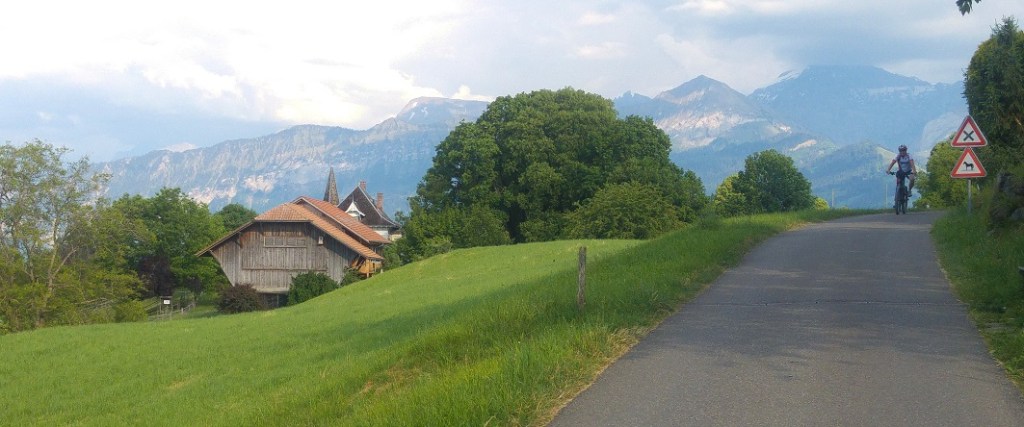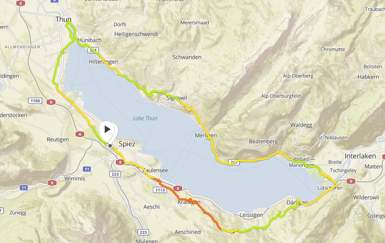 En resumen: La vuelta alrededor del lago Thun es probablemente la vuelta más dura y aventurosa que he hecho; había monte, subida, bajada, bosque, calle, caminitos con barro, escaleras, puentes colgantes…Pero lo logramos. (53 km, 5 h, 932 m subiendo, 1011 m bajando)