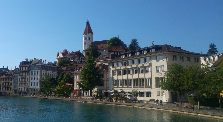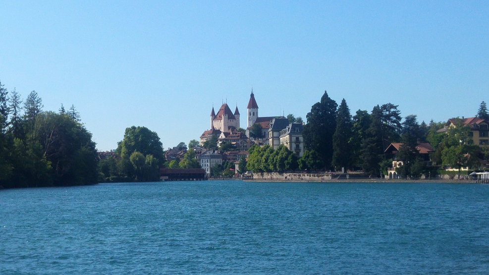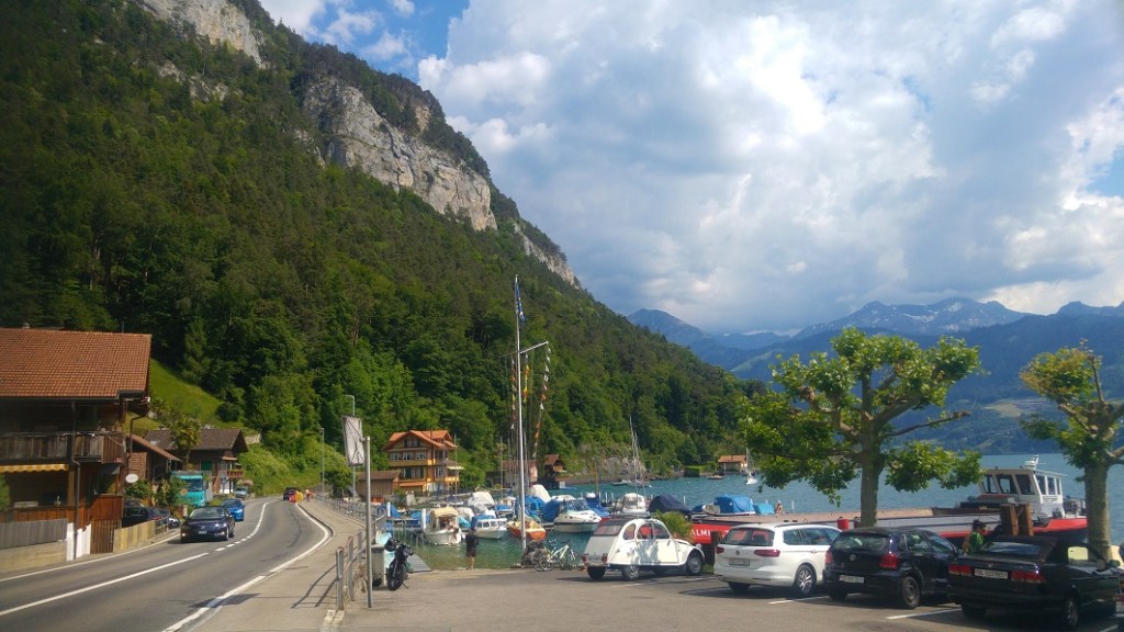 Loppumatka Thunin on pitkälti rantatietä, jolla on pyhäpäivän paluuruuhka. Ajamme jalkakäytävällä, kunnes vaihdamme aivan rantaan vievälle pyörätielle. Talot ovat hulppeita; mies pesee Ferraria ruusujen reunustaman valkoisen talon edustalla. Pihalla suihkulähde pirskottaa vettä ilmoihin. Thunissa on varakasta porukkaa.