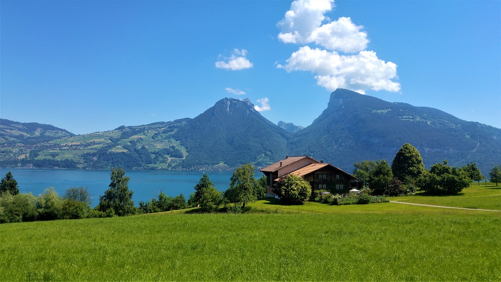Nousemme välillä jyrkempää, toisinaan kevyempää tietä. Järven sinisyys ja lähivuoret häikäisevät upeudellaan. Reittiä reunustavat luomu-maatilat ja tratorin ratissa näkyy parkkiintuneita tyyppejä, jotka lienevät ajelleen näitä niittyjä jo viime vuosisadan alkupuolella.
