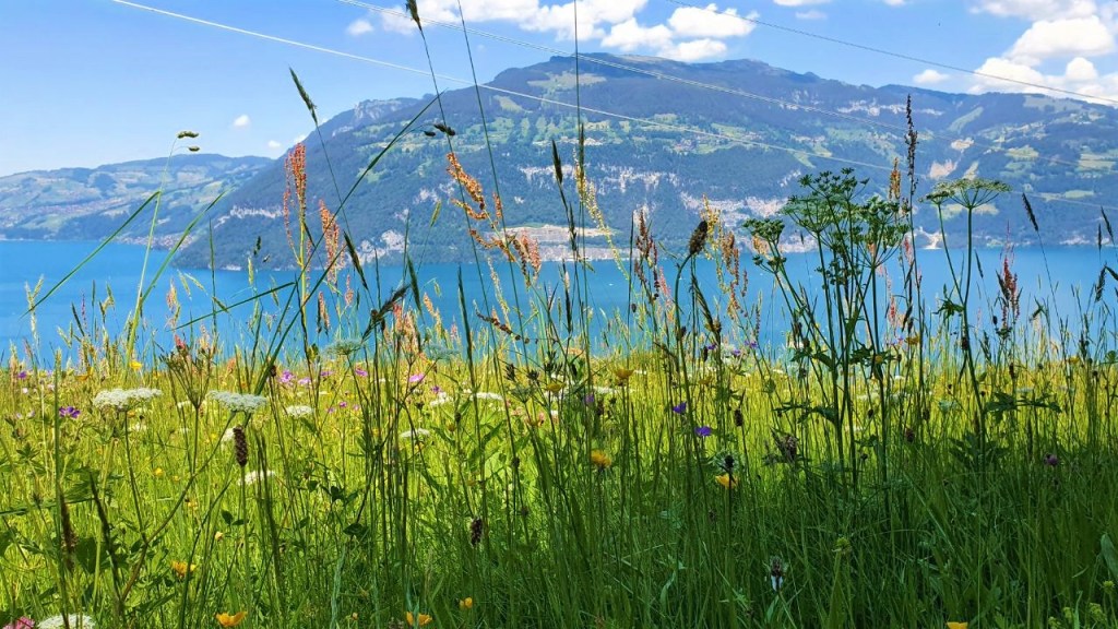 Onneksi mukana on leivät ja muuta evästä, edellispäivänä tehtyä raparperipiirakkaakin. Se että kuljemme pikkupolkuja ja -teitä tarkoittaa, ettei reitin ensimmäiselle puolikkaalle osu kuin yksi levähdyspaikka, josta hankkia lisäapetta tai juomista. Tankkaamme myöhemmin nestettä, luumupiirakkaa ja jätskiä järven toisessa ääripäässä Unterseen lähellä leirintäalueen kahvilassa.