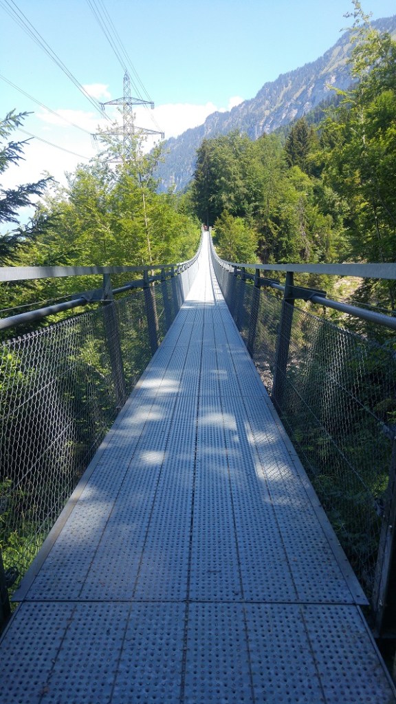 Siegriswilin 182 metrin korkeudessa roikkuva riippusilta on yksi maailman pisimmistä jalankulkijoille tarkoitetuista silloista. Reissun tässä vaiheessa 344 m tuntuu pitkältä, mutten jaksa sitä kovin ihmetellä. Haluan vain eteenpäin ja katson kelloa. Ilta on tulossa, lounas syömättä.