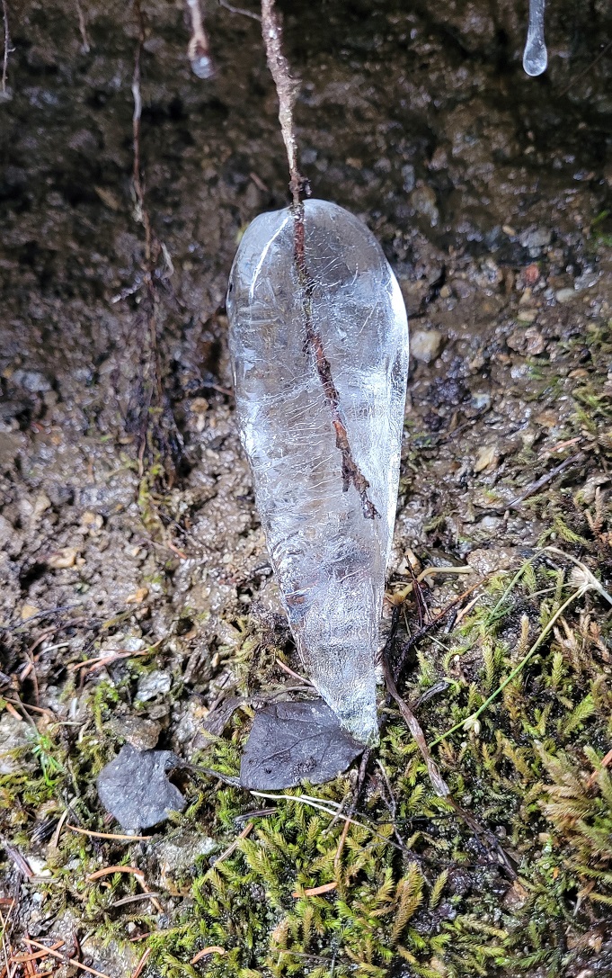 Juuresta roikkuva jäinen kyynel oli varmasti luonnon tekosia, kaunis ja ihmeellinen, Puikko olisi ollut liian painava juurelle, ellei se olisi ottanut tukea sammalesta.