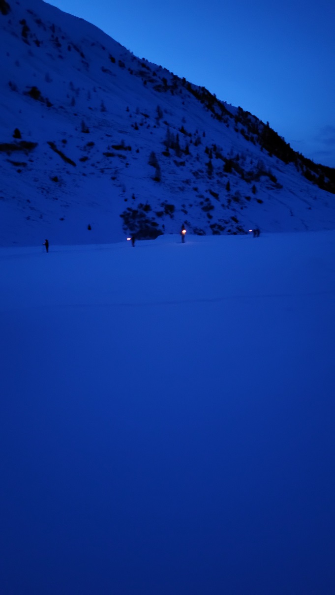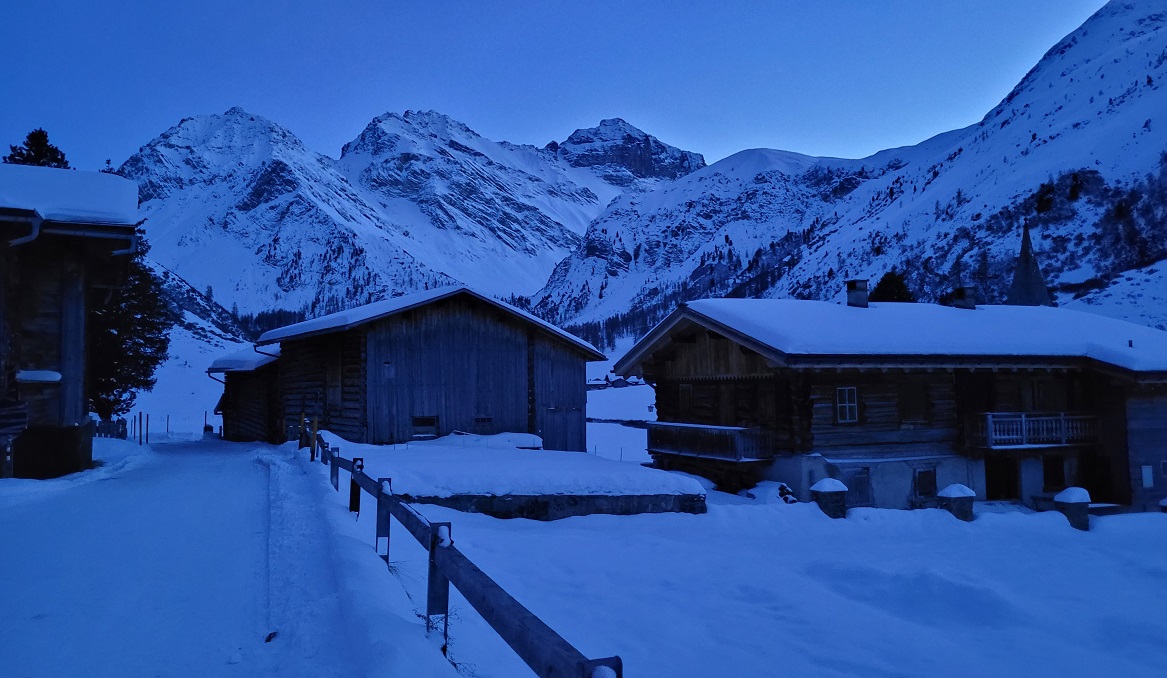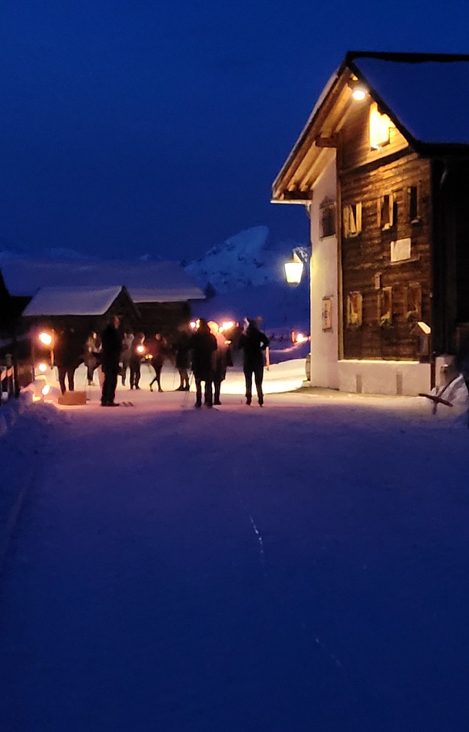 Laakson viimeinen kylä on Sertig. Aurinko oli jo laskenut ja sininen valo täytti vuorten välin, peitti valkoiset rinteet. Bergführer ravintolan terassi oli täynnä porukkaa, edustalla kymmeniä suksia. Kylän pienessä kirkossa vietetyn hääseremonian jälkeen seurue nautti aperot ulkona ja sitten suksille. Palavat soihdut käsissä porukka katosi alaspäin mäkeä kaartaen kuin kiiltomadot peräperää kohti laaksoa.