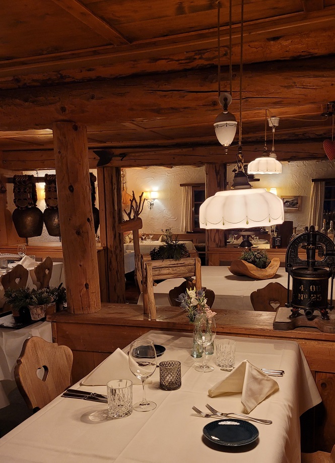 450-vuotisessa tuvassa oli tyhjää. Kauniin kattauksen kankaisine servietteineen olisi pitänyt kertoa, että nyt ollaan ehkä vähän hintavammassa paikassa, mutta nälkä ja kylmä ei antanut sijaa ajatuksille. Useimmiten alppimajat keskivertoja joka suhteessa, enkä osannut odottaa muuta tältäkään paikalta.